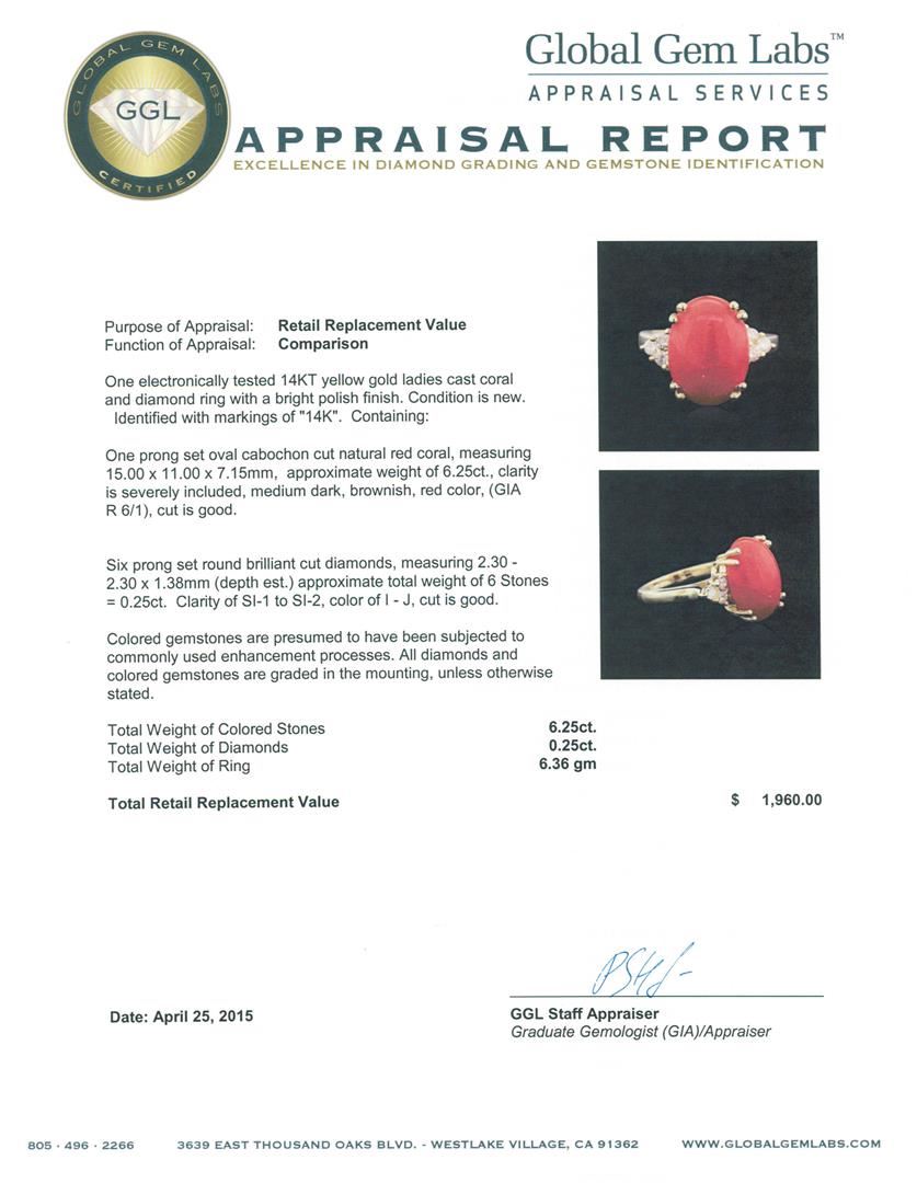 One electronically tested 14KT yellow gold ladies cast coral and diamond ring with a bright polish finish. Identified with markings of "14K". Condition is new. Containing: One prong set oval cabochon cut natural red coral, measuring 15.00 x 11.00 x 7.15mm, approximate weight of 6.25ct., clarity is severely included, medium dark, brownish, red color, (GIA R 6/1), cut is good. Six prong set round brilliant cut diamonds, measuring 2.30 - 2.30 x 1.38mm (depth est.) approximate total weight of 6 Stones = 0.25ct. Clarity: SI-1 to SI-2. Color: I - J, Cut is Good. Colored gemstones are presumed to have been subjected to commonly used enhancement processes. All diamonds and colored gemstones are graded in the mounting, unless otherwise stated. Total Weight of Colored Stones 6.25ct. Total Weight of Diamonds 0.25ct. Total Weight of Ring 6.36 grams. GGL Appraised at $1,960.00.