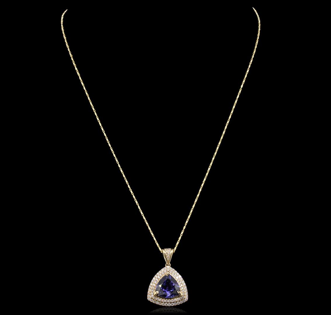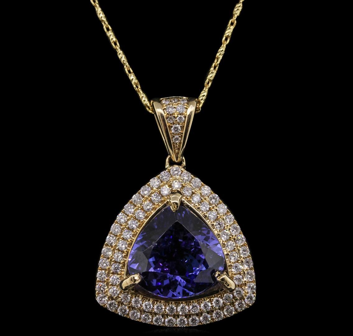 One electronically tested 14KT yellow gold ladies cast & assembled tanzanite and diamond pendant with chain. The pendant features a tanzanite set within two tiered diamond bezels, completed by a diamond set bail. The pendant is supported by an eighteen inch length 14KT yellow gold designer style chain, terminating in a lobster claw clasp. Bright polish finish. Identified with markings of "14K". Condition is new, good workmanship. Containing: One prong set pear brilliant cut natural tanzanite, measuring 11.60 x 11.90 x 6.60mm, 6% bulge factor, approximate weight of 6.47ct., clarity is eye clean, type I, medium dark, slightly grayish, violetish blue color, (GIA vB 6/2), cut is good. Transmitting light with no distortion, transparent. Colored Stone Grading Report attached. Graded in the setting. Tanzanite is a very rare gemstone that is only found in the country of Tanzania. Originally discovered in 1967. Tiffany & Company, named the stone Tanzanite. It is found in the Usumburu Mountains that border the Umba Valley of northern Tanzania. Tanzanite occurs in gray, brown, violet, blue, reddish-purple, & green. The gem is interesting because of its exceptional pleochroism. Rotated in different directions a tanzanite will exhibit multiple changes of color. Tanzanite has a low tolerance to ultrasonic cleaning, and should not be cleaned using this method. Eighty-One prong set round brilliant cut diamonds, measuring 1.50 - 1.30 x 0.84mm (depth est.) approximate total weight of 81 Stones = 0.91ct. Graded in the setting. Clarity: SI-1 to I-1. Color: G - I. Total Weight of Colored Stones 6.47ct. Total Weight of Diamonds 0.91ct. Total Weight of Pendant With Chain 8.94 grams. AIG Appraised at $17,795.00.