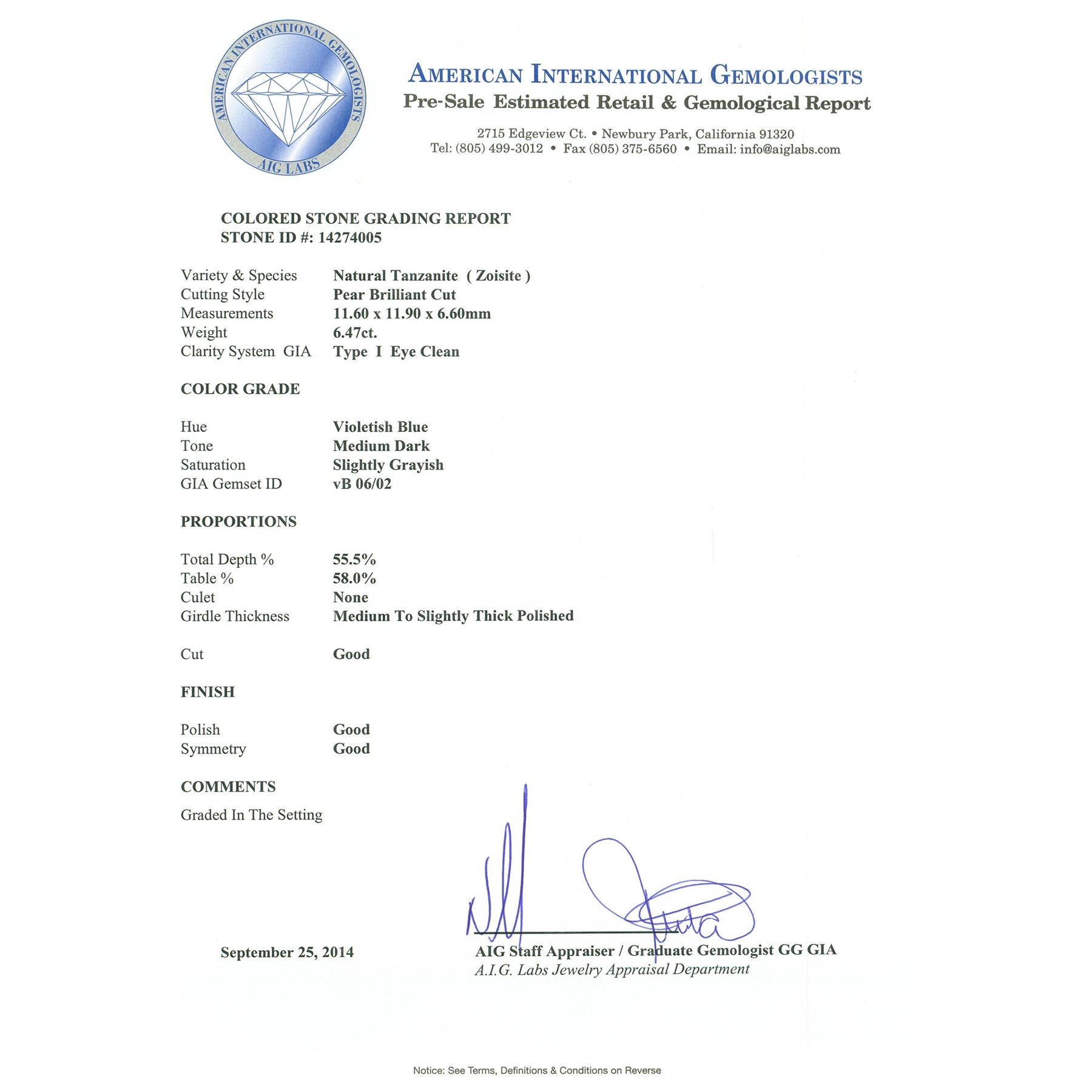 One electronically tested 14KT yellow gold ladies cast & assembled tanzanite and diamond pendant with chain. The pendant features a tanzanite set within two tiered diamond bezels, completed by a diamond set bail. The pendant is supported by an eighteen inch length 14KT yellow gold designer style chain, terminating in a lobster claw clasp. Bright polish finish. Identified with markings of "14K". Condition is new, good workmanship. Containing: One prong set pear brilliant cut natural tanzanite, measuring 11.60 x 11.90 x 6.60mm, 6% bulge factor, approximate weight of 6.47ct., clarity is eye clean, type I, medium dark, slightly grayish, violetish blue color, (GIA vB 6/2), cut is good. Transmitting light with no distortion, transparent. Colored Stone Grading Report attached. Graded in the setting. Tanzanite is a very rare gemstone that is only found in the country of Tanzania. Originally discovered in 1967. Tiffany & Company, named the stone Tanzanite. It is found in the Usumburu Mountains that border the Umba Valley of northern Tanzania. Tanzanite occurs in gray, brown, violet, blue, reddish-purple, & green. The gem is interesting because of its exceptional pleochroism. Rotated in different directions a tanzanite will exhibit multiple changes of color. Tanzanite has a low tolerance to ultrasonic cleaning, and should not be cleaned using this method. Eighty-One prong set round brilliant cut diamonds, measuring 1.50 - 1.30 x 0.84mm (depth est.) approximate total weight of 81 Stones = 0.91ct. Graded in the setting. Clarity: SI-1 to I-1. Color: G - I. Total Weight of Colored Stones 6.47ct. Total Weight of Diamonds 0.91ct. Total Weight of Pendant With Chain 8.94 grams. AIG Appraised at $17,795.00.
