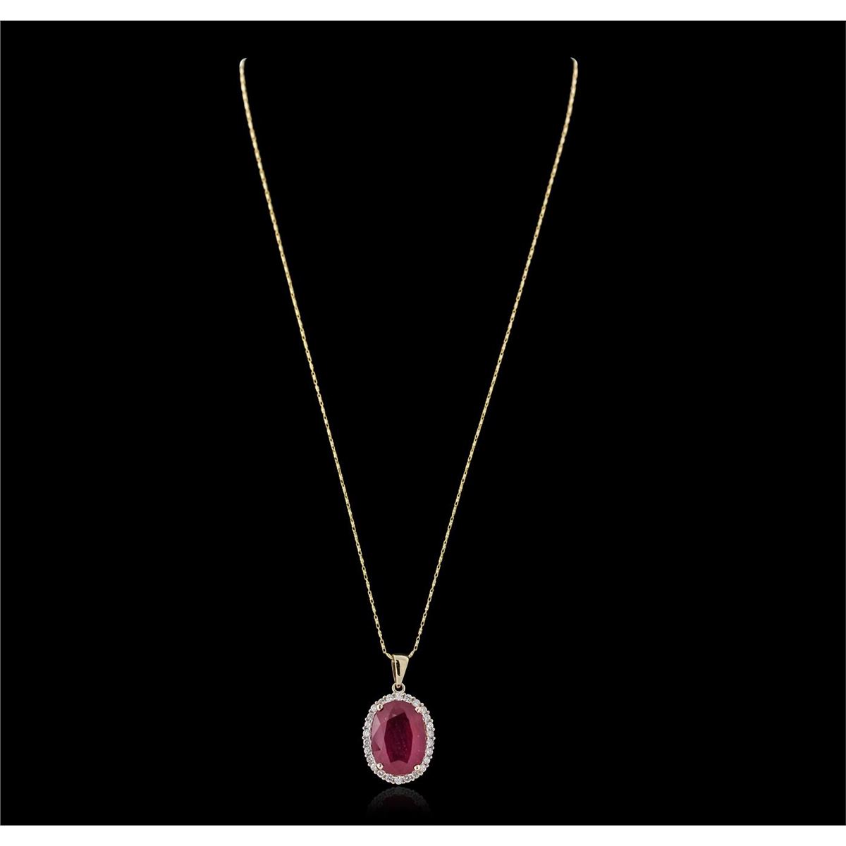 One electronically tested 14KT yellow gold ladies cast & assembled ruby and diamond pendant with chain. The pendant features a ruby set within a diamond bezel, completed by a yellow gold bail. The pendant is supported by an eighteen inch length 14KT yellow gold designer style chain, terminating in a lobster claw clasp. Bright polish finish with rhodium accents. Trademark is Orianne. Identified with markings of "14K". Condition is new, good workmanship. Containing: One prong set oval mixed cut natural ruby, measuring 7.54 x 12.67 x 7.20mm, 10% bulge factor, approximate weight of 6.47ct., clarity is heavily included, type II, medium dark, very slightly brownish, slightly purplish red color, (GIA slpR 6/3), cut is good. Transmitting light somewhat diffusely, transparent to translucent. Naturally occurring internal & external characteristics are present. Indications of laboratory high temperature heat treatment, with glass & flux additives. Graded in the setting. Ruby has a low tolerance to rhodium plating, repolishing the surface, & ultrasonic cleaning. Twenty-Six prong set round brilliant cut diamonds, measuring 2.00 - 1.90 x 1.17mm (depth est.) approximate total weight of 26 Stones = 0.80ct. Graded in the setting. Clarity: SI-1 to I-1. Color: H - J. Total Weight of Colored Stones 6.47ct. Total Weight of Diamonds 0.80ct. Total Weight of Pendant With Chain 9.62 grams. AIG Appraised at $5,010.00.