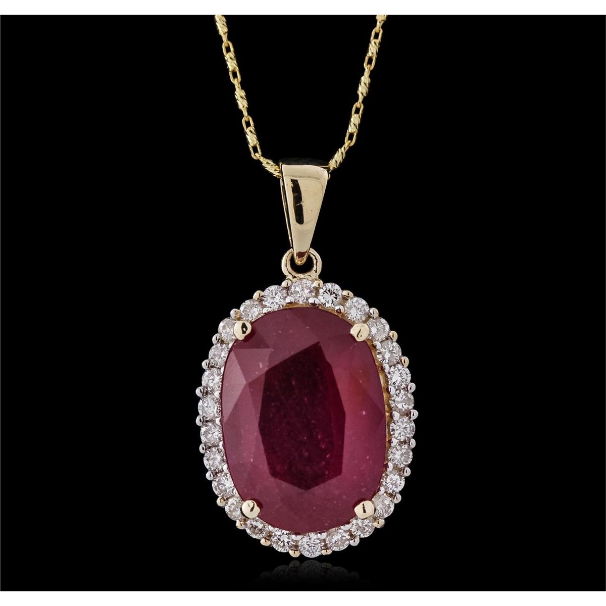 One electronically tested 14KT yellow gold ladies cast & assembled ruby and diamond pendant with chain. The pendant features a ruby set within a diamond bezel, completed by a yellow gold bail. The pendant is supported by an eighteen inch length 14KT yellow gold designer style chain, terminating in a lobster claw clasp. Bright polish finish with rhodium accents. Trademark is Orianne. Identified with markings of "14K". Condition is new, good workmanship. Containing: One prong set oval mixed cut natural ruby, measuring 7.54 x 12.67 x 7.20mm, 10% bulge factor, approximate weight of 6.47ct., clarity is heavily included, type II, medium dark, very slightly brownish, slightly purplish red color, (GIA slpR 6/3), cut is good. Transmitting light somewhat diffusely, transparent to translucent. Naturally occurring internal & external characteristics are present. Indications of laboratory high temperature heat treatment, with glass & flux additives. Graded in the setting. Ruby has a low tolerance to rhodium plating, repolishing the surface, & ultrasonic cleaning. Twenty-Six prong set round brilliant cut diamonds, measuring 2.00 - 1.90 x 1.17mm (depth est.) approximate total weight of 26 Stones = 0.80ct. Graded in the setting. Clarity: SI-1 to I-1. Color: H - J. Total Weight of Colored Stones 6.47ct. Total Weight of Diamonds 0.80ct. Total Weight of Pendant With Chain 9.62 grams. AIG Appraised at $5,010.00.