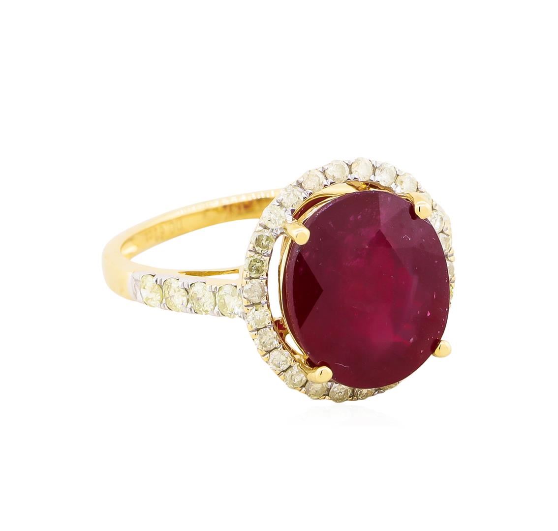 One electronically tested 14KT yellow gold ladies cast ruby and diamond ring. The featured ruby is set within a diamond bezel supported by an elaborate lattice under gallery and diamond ribbon shoulders, completed by a one millimeter wide band. Bright polish finish with rhodium accents. Trademark is Orianne. Identified with markings of "14K". Condition is new, good workmanship. Containing: One prong set oval mixed cut natural ruby approximate weight of 6.47ct., clarity is heavily included, type II, medium dark, very slightly brownish, slightly purplish red color, (GIA slpR 6/3), cut is good. Transmitting light somewhat diffusely, transparent to translucent. Naturally occurring internal & external characteristics are present. Indications of laboratory high temperature heat treatment, with glass & flux additives. Graded in the setting. Ruby has a low tolerance to rhodium plating, repolishing the surface, & ultrasonic cleaning.Thirty-Four prong set round brilliant cut diamonds approximate. Total Weight of 34 Stones = 0.62ct. The group is composed of a mix of natural very light yellow and light yellow color diamonds. Graded in the setting. Clarity: I-1 to I-3. Total Weight of Colored Stones 6.47ct. Total Weight of Diamonds 0.62ct. Total Weight of Ring 3.77gm. AIG Appraised at $2,585.00.