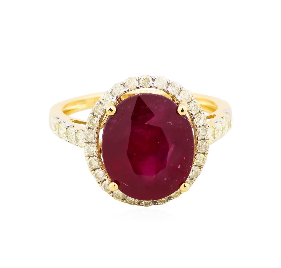 One electronically tested 14KT yellow gold ladies cast ruby and diamond ring. The featured ruby is set within a diamond bezel supported by an elaborate lattice under gallery and diamond ribbon shoulders, completed by a one millimeter wide band. Bright polish finish with rhodium accents. Trademark is Orianne. Identified with markings of "14K". Condition is new, good workmanship. Containing: One prong set oval mixed cut natural ruby approximate weight of 6.47ct., clarity is heavily included, type II, medium dark, very slightly brownish, slightly purplish red color, (GIA slpR 6/3), cut is good. Transmitting light somewhat diffusely, transparent to translucent. Naturally occurring internal & external characteristics are present. Indications of laboratory high temperature heat treatment, with glass & flux additives. Graded in the setting. Ruby has a low tolerance to rhodium plating, repolishing the surface, & ultrasonic cleaning.Thirty-Four prong set round brilliant cut diamonds approximate. Total Weight of 34 Stones = 0.62ct. The group is composed of a mix of natural very light yellow and light yellow color diamonds. Graded in the setting. Clarity: I-1 to I-3. Total Weight of Colored Stones 6.47ct. Total Weight of Diamonds 0.62ct. Total Weight of Ring 3.77gm. AIG Appraised at $2,585.00.