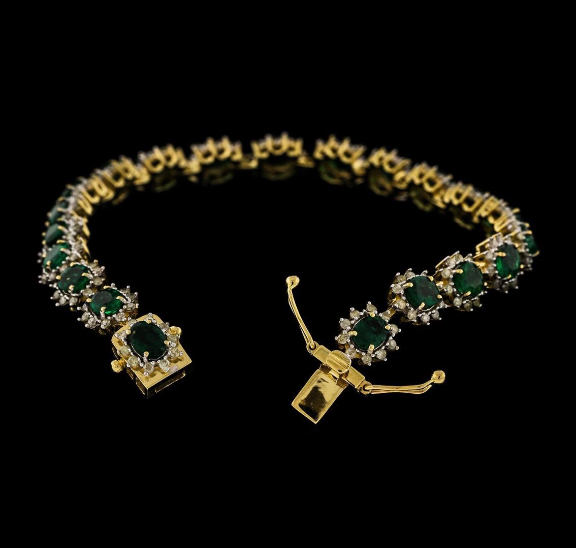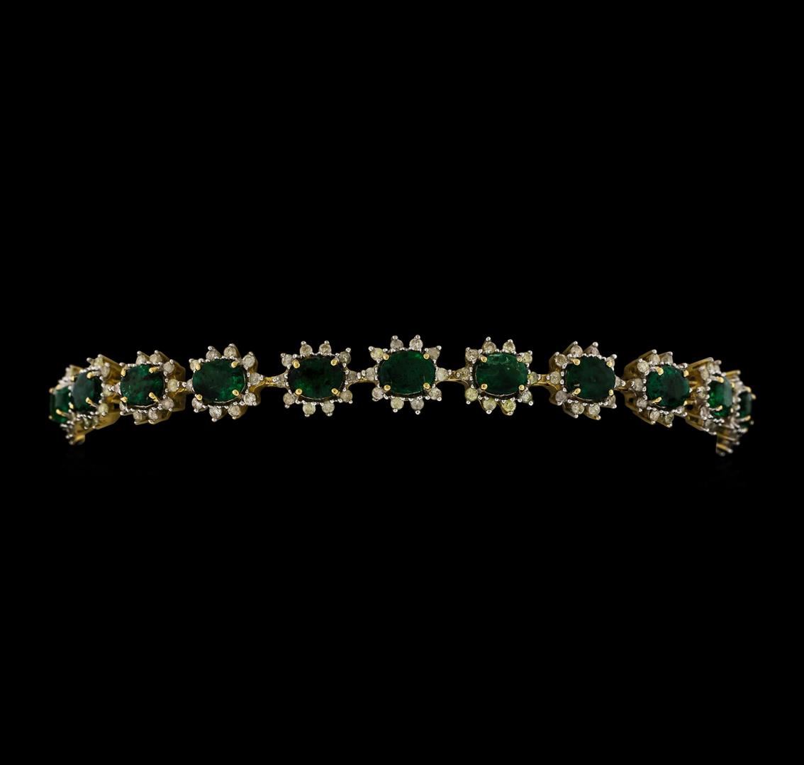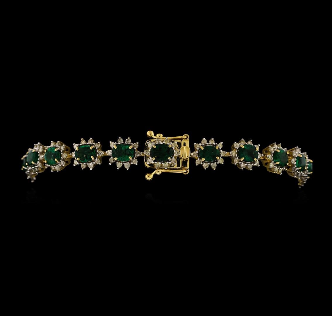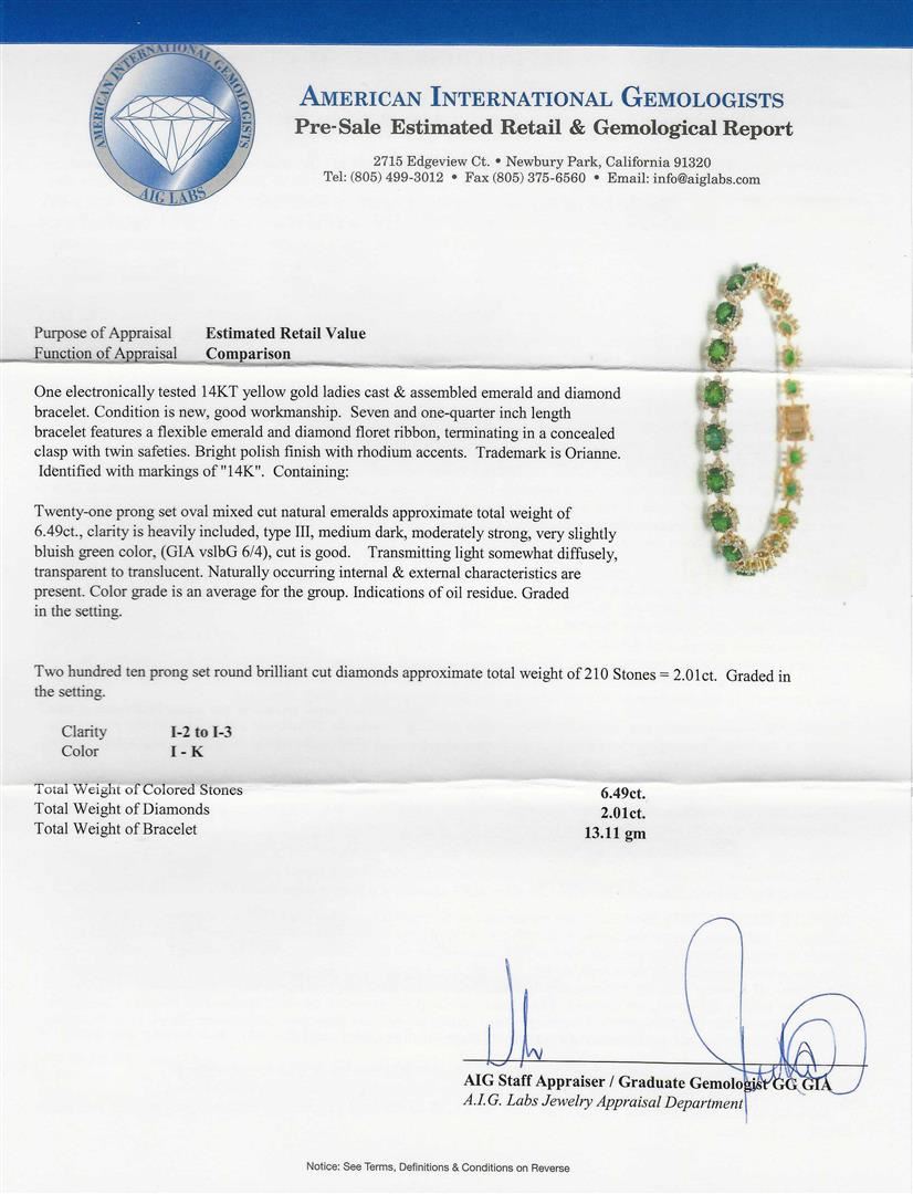 One electronically tested 14KT yellow gold ladies cast & assembled emerald and diamond bracelet. Condition is new, good workmanship. Seven and one-quarter inch length bracelet features a flexible emerald and diamond floret ribbon, terminating in a concealed clasp with twin safeties. Bright polish finish with rhodium accents. Trademark is Orianne. Identified with markings of" 14K". Containing: Twenty-one prong set oval mixed cut natural emeralds approximate total weight of 6.49ct., clarity is heavily included, type Ill, medium dark, moderately strong, very slightly bluish green color, (GIA vslbG 6/4), cut is good. Transmitting light somewhat diffusely, transparent to translucent. Naturally occurring internal & external characteristics are present. Color grade is an average for the group. Indications of oil residue. Graded in the setting. Two hundred ten prong set round brilliant cut diamonds approximate total weight of 210 stones is 2.01cts. Graded in the setting. Clarity (I-2 to I-3) and color of I-K. Total weight of colored stones 6.49cts. Total weight of diamonds is 2.01cts. Total weight of bracelet is 13.11 grams. AIG Appraised.