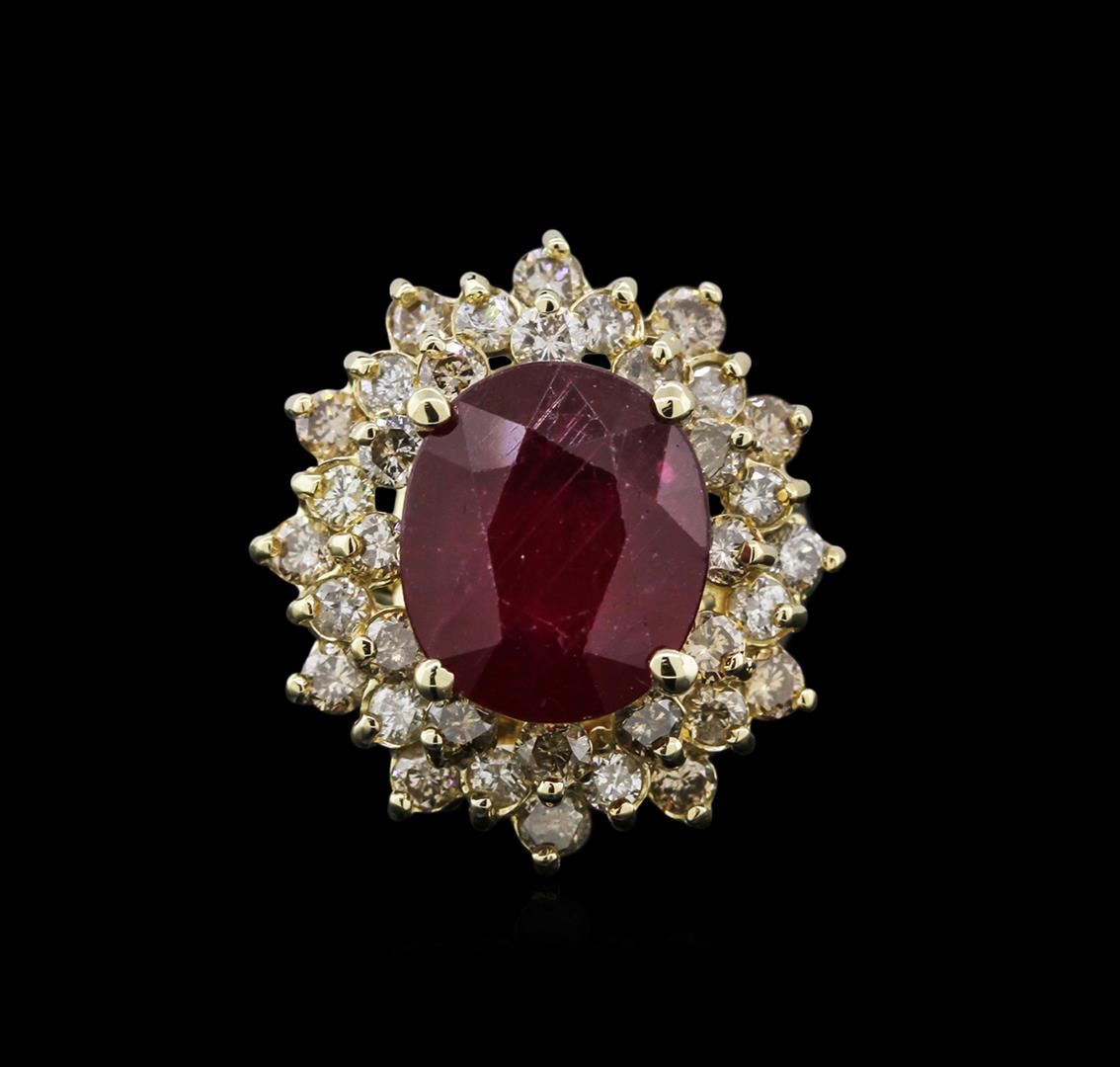 One electronically tested 14KT yellow gold ladies cast ruby and diamond ring with a bright polish finish. Identified with markings of "K14". Condition is new. Containing: One prong set oval modified brilliant cut natural ruby, measuring 12.17 x 10.48 x 6.10mm, approximate weight of 6.54ct., clarity is heavily included, type II, medium dark, very slightly brownish, strongly purplish red color, (GIA stpR 6/3), cut is good. Thirty-Six prong set round brilliant cut diamonds, measuring 2.20 - 2.20 x 1.32mm (depth est.) approximate total weight of 36 Stones = 1.40ct. Clarity: I-1 to I-3. Color: K - L, Cut is Good. Diamonds and colored gemstones are graded in the mounting, unless otherwise stated. Colored gemstones are presumed to have been subjected to commonly used enhancement processes. Total Weight of Colored Stones 6.54ct. Total Weight of Diamonds 1.40ct. Total Weight of Ring 8.50 grams. GGL Appraised at $3,560.00.