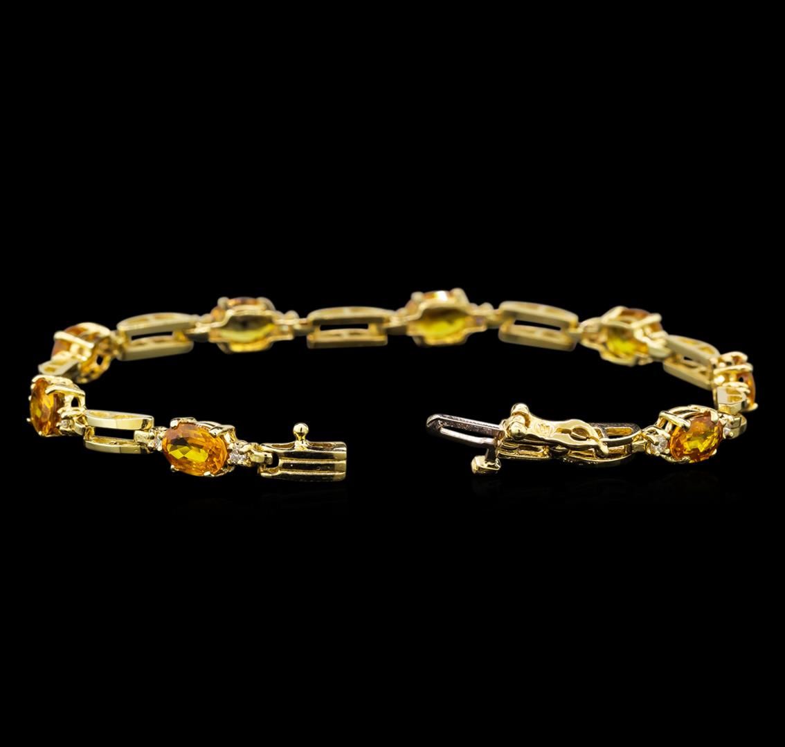 One electronically tested 14KT yellow gold ladies cast sapphire and diamond bracelet with a hidden box clasp with safety closer with a bright polish finish. Measurements: 6.50" in length. Identified with markings of "14K". Condition is new. Containing: Eight prong set oval modified brilliant cut natural yellow sapphires, measuring 6.50 x 4.80 x 3.12mm, approximate total weight of 6.56ct., clarity is slightly included, type II, medium light, brownish, orangy yellow color, (GIA oY 4/3), cut is good. Sixteen prong set round brilliant cut diamonds, measuring 1.30 - 1.30 x 0.78mm (depth est.) approximate total weight of 16 Stones = 0.13ct. Clarity: SI-1 to SI-2. Color: J - K, Cut is Good. Colored gemstones are presumed to have been subjected to commonly used enhancement processes. All diamonds and colored gemstones are graded in the mounting, unless otherwise stated. Total Weight of Colored Stones 6.56ct. Total Weight of Diamonds 0.13ct. Total Weight of Bracelet 9.30 grams. GGL Appraised at $2,730.00.