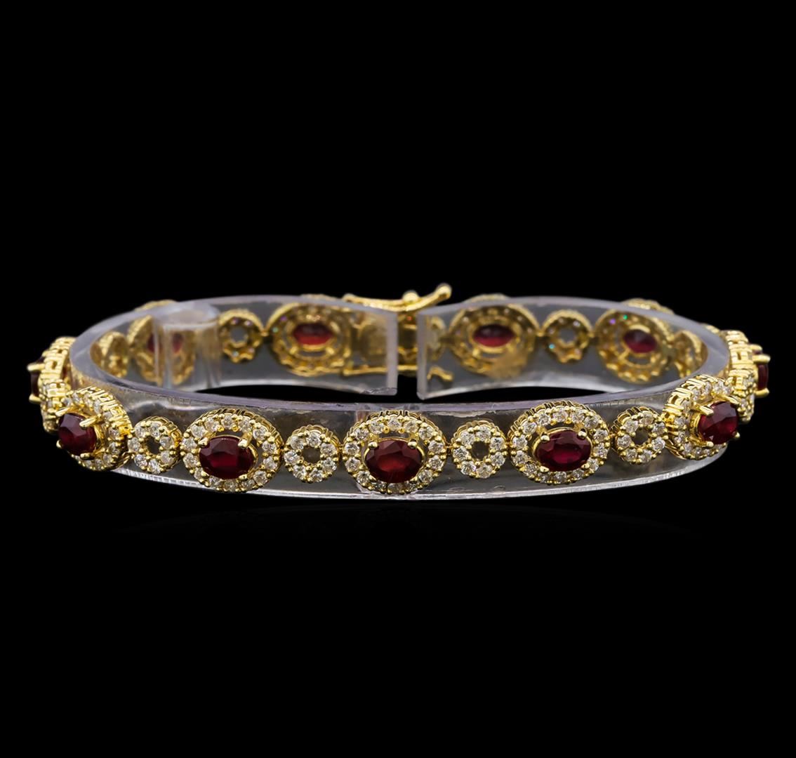 One electronically tested 14KT yellow gold ladies cast ruby and diamond bracelet with a hidden box clasp with safety closer with a bright polish finish. Measurements: 7" in length. Identified with markings of "585". Condition is new. Containing: Eleven prong set oval modified brilliant cut natural rubies, measuring 5.50 x 4.00 x 2.60mm, approximate total weight of 6.65ct., clarity is heavily included, medium dark, moderately strong, strongly purplish red color, (GIA stpR 6/4), cut is good. Two Hundred Thirty-One prong set round brilliant cut diamonds, measuring 1.50 - 1.50 x 0.90mm (depth est.) approximate total weight of 231 Stones = 2.93ct. Clarity: I-1 to I-2. Color: J - K, Cut is Good. Colored gemstones are presumed to have been subjected to commonly used enhancement processes. All diamonds and colored gemstones are graded in the mounting, unless otherwise stated. Total Weight of Colored Stones 6.65ct. Total Weight of Diamonds 2.93ct. Total Weight of Bracelet 13.50 grams. GGL Appraised at $6,620.00.