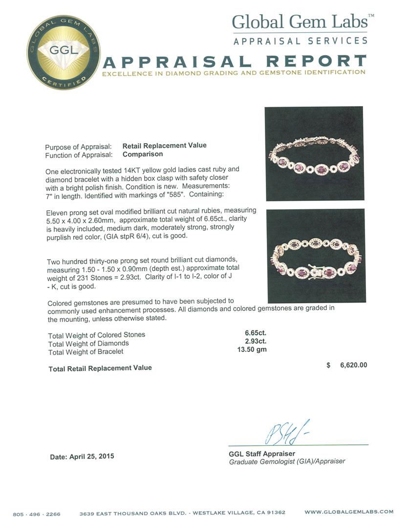 One electronically tested 14KT yellow gold ladies cast ruby and diamond bracelet with a hidden box clasp with safety closer with a bright polish finish. Measurements: 7" in length. Identified with markings of "585". Condition is new. Containing: Eleven prong set oval modified brilliant cut natural rubies, measuring 5.50 x 4.00 x 2.60mm, approximate total weight of 6.65ct., clarity is heavily included, medium dark, moderately strong, strongly purplish red color, (GIA stpR 6/4), cut is good. Two Hundred Thirty-One prong set round brilliant cut diamonds, measuring 1.50 - 1.50 x 0.90mm (depth est.) approximate total weight of 231 Stones = 2.93ct. Clarity: I-1 to I-2. Color: J - K, Cut is Good. Colored gemstones are presumed to have been subjected to commonly used enhancement processes. All diamonds and colored gemstones are graded in the mounting, unless otherwise stated. Total Weight of Colored Stones 6.65ct. Total Weight of Diamonds 2.93ct. Total Weight of Bracelet 13.50 grams. GGL Appraised at $6,620.00.