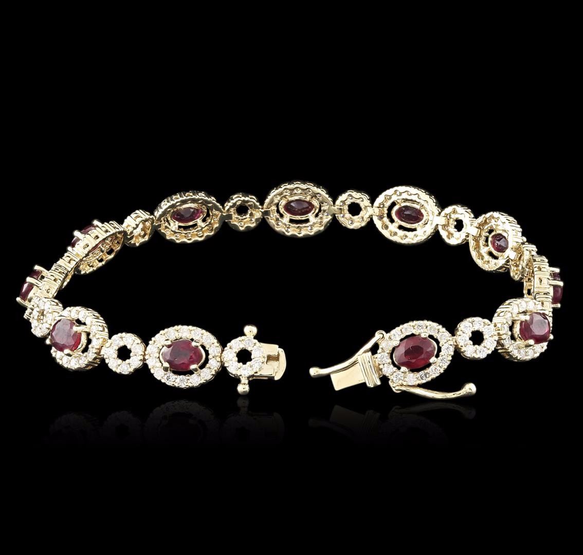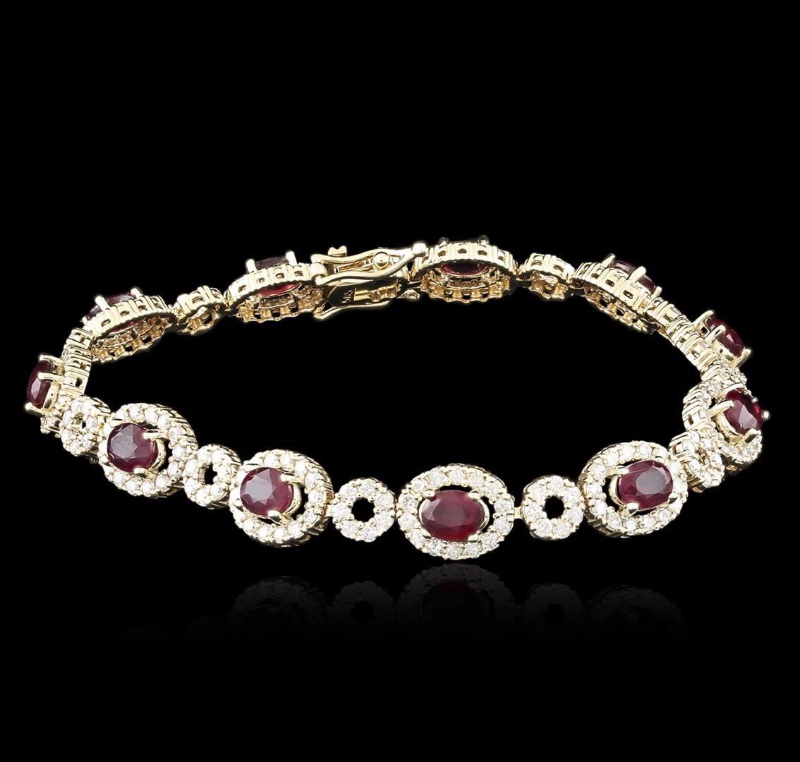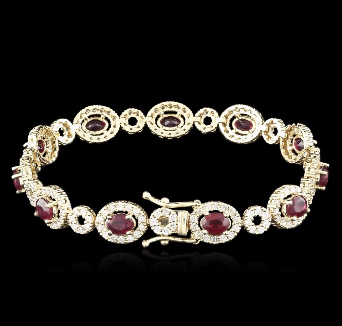 One electronically tested 14KT yellow gold ladies cast ruby and diamond bracelet with a hidden box clasp with safety closer with a bright polish finish. Measurements: 7" in length. Identified with markings of "585". Condition is new. Containing: Eleven prong set oval modified brilliant cut natural rubies, measuring 5.50 x 4.00 x 2.60mm, approximate total weight of 6.65ct., clarity is heavily included, medium dark, moderately strong, strongly purplish red color, (GIA stpR 6/4), cut is good. Two Hundred Thirty-One prong set round brilliant cut diamonds, measuring 1.50 - 1.50 x 0.90mm (depth est.) approximate total weight of 231 Stones = 2.93ct. Clarity: I-1 to I-2. Color: J - K, Cut is Good. Colored gemstones are presumed to have been subjected to commonly used enhancement processes. All diamonds and colored gemstones are graded in the mounting, unless otherwise stated. Total Weight of Colored Stones 6.65ct. Total Weight of Diamonds 2.93ct. Total Weight of Bracelet 13.50 grams. GGL Appraised at $6,620.00.