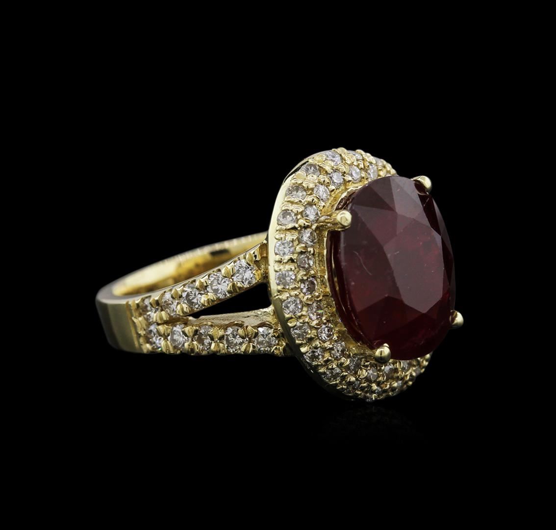 One electronically tested 14KT yellow gold ladies cast ruby and diamond ring with a split shoulder shank with a bright polish finish. Identified with markings of "14K". Condition is new. Containing: One prong set oval modified brilliant cut natural ruby, measuring 13.07 x 11.04 x 5.51mm, approximate weight of 6.68ct., clarity is heavily included, type II, dark, very slightly brownish, strongly purplish red color, (GIA stpR 7/3), cut is good. Sixty-Eight prong set round brilliant cut diamonds, measuring 1.50 - 1.50 x 0.90mm (depth est.) approximate total weight of 68 Stones = 0.84ct. Clarity: SI-1 to I-1. Color: L - M, Cut is Good. Diamonds and colored gemstones are graded in the mounting, unless otherwise stated. Colored gemstones are presumed to have been subjected to commonly used enhancement processes. Total Weight of Colored Stones 6.68ct. Total Weight of Diamonds 0.84ct. Total Weight of Ring 11.00 grams. GGL Appraised at $4,460.00.