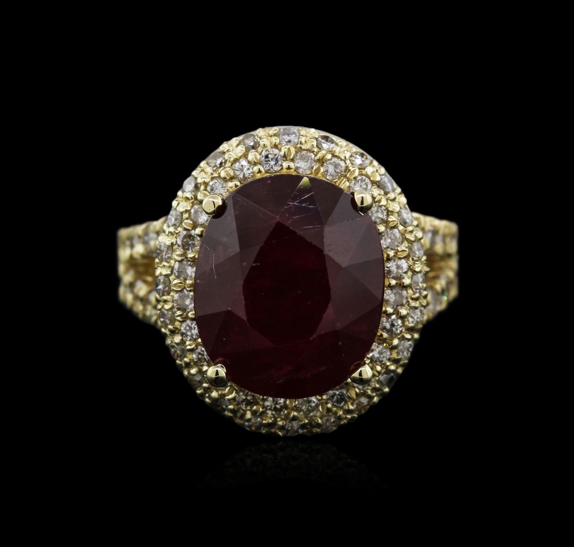 One electronically tested 14KT yellow gold ladies cast ruby and diamond ring with a split shoulder shank with a bright polish finish. Identified with markings of "14K". Condition is new. Containing: One prong set oval modified brilliant cut natural ruby, measuring 13.07 x 11.04 x 5.51mm, approximate weight of 6.68ct., clarity is heavily included, type II, dark, very slightly brownish, strongly purplish red color, (GIA stpR 7/3), cut is good. Sixty-Eight prong set round brilliant cut diamonds, measuring 1.50 - 1.50 x 0.90mm (depth est.) approximate total weight of 68 Stones = 0.84ct. Clarity: SI-1 to I-1. Color: L - M, Cut is Good. Diamonds and colored gemstones are graded in the mounting, unless otherwise stated. Colored gemstones are presumed to have been subjected to commonly used enhancement processes. Total Weight of Colored Stones 6.68ct. Total Weight of Diamonds 0.84ct. Total Weight of Ring 11.00 grams. GGL Appraised at $4,460.00.