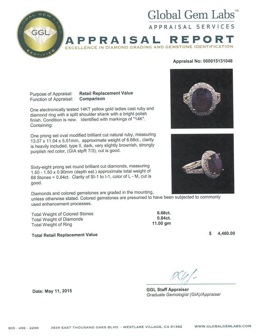 One electronically tested 14KT yellow gold ladies cast ruby and diamond ring with a split shoulder shank with a bright polish finish. Identified with markings of "14K". Condition is new. Containing: One prong set oval modified brilliant cut natural ruby, measuring 13.07 x 11.04 x 5.51mm, approximate weight of 6.68ct., clarity is heavily included, type II, dark, very slightly brownish, strongly purplish red color, (GIA stpR 7/3), cut is good. Sixty-Eight prong set round brilliant cut diamonds, measuring 1.50 - 1.50 x 0.90mm (depth est.) approximate total weight of 68 Stones = 0.84ct. Clarity: SI-1 to I-1. Color: L - M, Cut is Good. Diamonds and colored gemstones are graded in the mounting, unless otherwise stated. Colored gemstones are presumed to have been subjected to commonly used enhancement processes. Total Weight of Colored Stones 6.68ct. Total Weight of Diamonds 0.84ct. Total Weight of Ring 11.00 grams. GGL Appraised at $4,460.00.