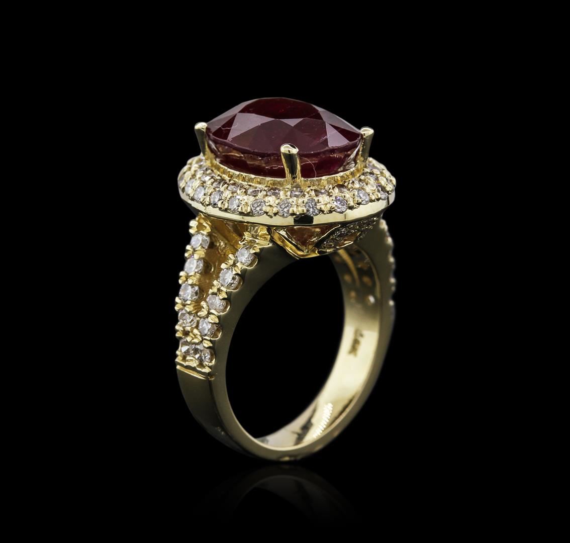 One electronically tested 14KT yellow gold ladies cast ruby and diamond ring with a split shoulder shank with a bright polish finish. Identified with markings of "14K". Condition is new. Containing: One prong set oval modified brilliant cut natural ruby, measuring 13.07 x 11.04 x 5.51mm, approximate weight of 6.68ct., clarity is heavily included, type II, dark, very slightly brownish, strongly purplish red color, (GIA stpR 7/3), cut is good. Sixty-Eight prong set round brilliant cut diamonds, measuring 1.50 - 1.50 x 0.90mm (depth est.) approximate total weight of 68 Stones = 0.84ct. Clarity: SI-1 to I-1. Color: L - M, Cut is Good. Diamonds and colored gemstones are graded in the mounting, unless otherwise stated. Colored gemstones are presumed to have been subjected to commonly used enhancement processes. Total Weight of Colored Stones 6.68ct. Total Weight of Diamonds 0.84ct. Total Weight of Ring 11.00 grams. GGL Appraised at $4,460.00.