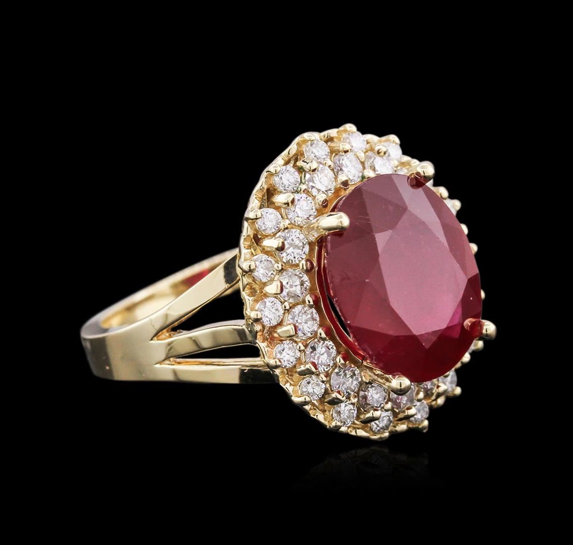One electronically tested 14KT yellow gold ladies cast ruby and diamond ring with a bright polish finish. Identified with markings of "14K". Condition is new. Containing: One prong set oval modified brilliant cut natural ruby, measuring 14.00. x 11.40 x 4.95mm, approximate weight of 6.72ct., clarity is heavily included, medium, moderately strong, purple red color, (GIA PR 5/4), cut is good. Forty prong set round brilliant cut diamonds, measuring 2.00. - 1.50 x 1.05mm (depth est.) approximate total weight of 40 Stones = 0.78ct. Clarity: SI-1 to SI-2. Color: I - J, Cut is Good. Colored gemstones are presumed to have been subjected to commonly used enhancement processes. All diamonds and colored gemstones are graded in the mounting, unless otherwise stated. Total Weight of Colored Stones 6.72ct. Total Weight of Diamonds 0.78ct. Total Weight of Ring 11.10 grams. GGL Appraised at $5,480.00.