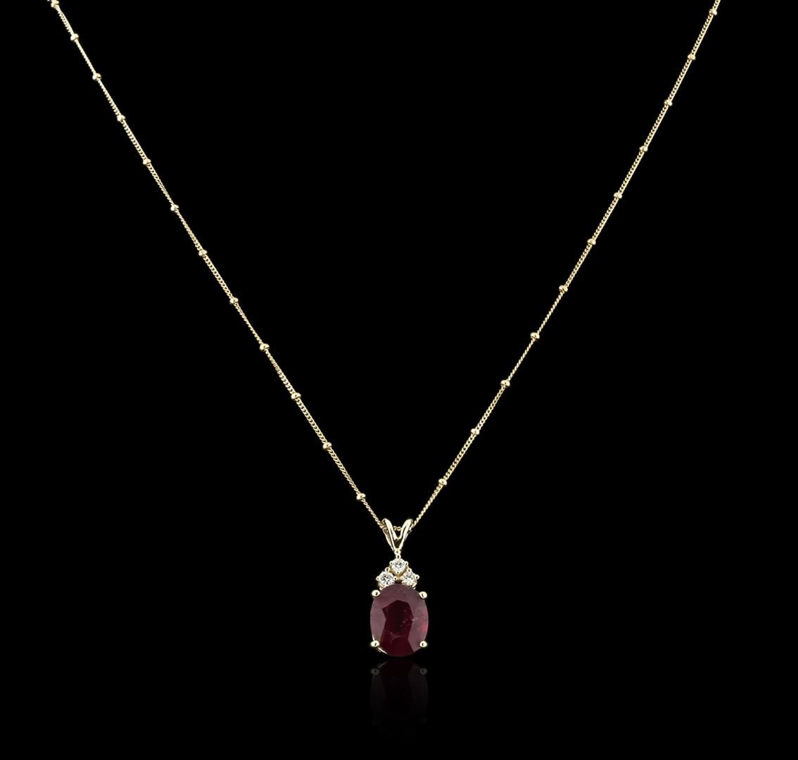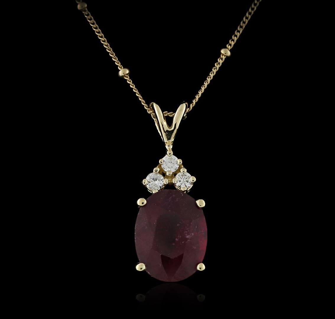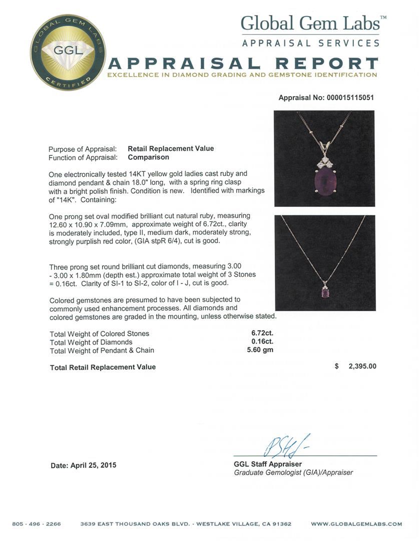 One electronically tested 14KT yellow gold ladies cast ruby and diamond pendant & chain 18.0" long, with a spring ring clasp with a bright polish finish. Identified with markings of "14K". Condition is new. Containing: One prong set oval modified brilliant cut natural ruby, measuring 12.60 x 10.90 x 7.09mm, approximate weight of 6.72ct., clarity is moderately included, type II, medium dark, moderately strong, strongly purplish red color, (GIA stpR 6/4), cut is good. Three prong set round brilliant cut diamonds, measuring 3.00 - 3.00 x 1.80mm (depth est.) approximate total weight of 3 Stones = 0.16ct. Clarity: SI-1 to SI-2. Color: I - J, Cut is Good. Colored gemstones are presumed to have been subjected to commonly used enhancement processes. All diamonds and colored gemstones are graded in the mounting, unless otherwise stated. Total Weight of Colored Stones 6.72ct. Total Weight of Diamonds 0.16ct. Total Weight of Pendant & Chain 5.60 grams. GGL Appraised at $2,395.00.
