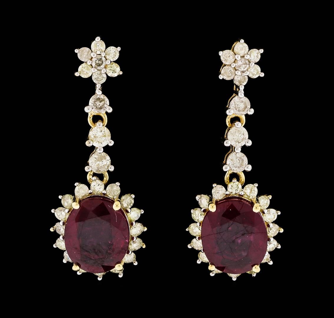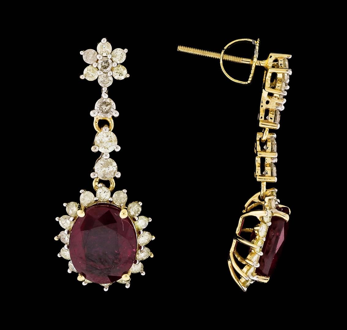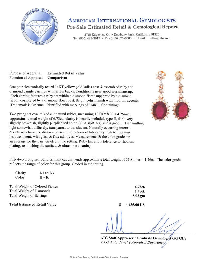 One pair electronically tested 14KT yellow gold ladies cast & assembled ruby and diamond dangle earrings with screw backs. Each earring features a ruby set within a diamond floret supported by a diamond ribbon completed by a diamond floret post. Bright polish finish with rhodium accents. Trademark is Orianne. Identified with markings of "14K". Condition is new, good workmanship. Containing: Two prong set oval mixed cut natural rubies, measuring 10.00 x 8.00 x 4.25mm, approximate total weight of 6.73ct., clarity is heavily included, type II, dark, very slightly brownish, slightly purplish red color, (GIA slpR 7/3), cut is good. Transmitting light somewhat diffusely, transparent to translucent. Naturally occurring internal & external characteristics are present. Indications of laboratory high temperature heat treatment, with glass & flux additives. Measurements & the color grade are an average for the pair. Graded in the setting. Ruby has a low tolerance to rhodium plating, repolishing the surface, & ultrasonic cleaning. Fifty-Two prong set round brilliant cut diamonds approximate total weight of 52 Stones = 1.46ct. The color grade reflects the range of color for this group. Graded in the setting. Clarity: I-1 to I-3. Color: H - K. Total Weight of Colored Stones 6.73ct. Total Weight of Diamonds 1.46ct. Total Weight of Earrings 5.03gm. AIG Appraised at $4,435.00.