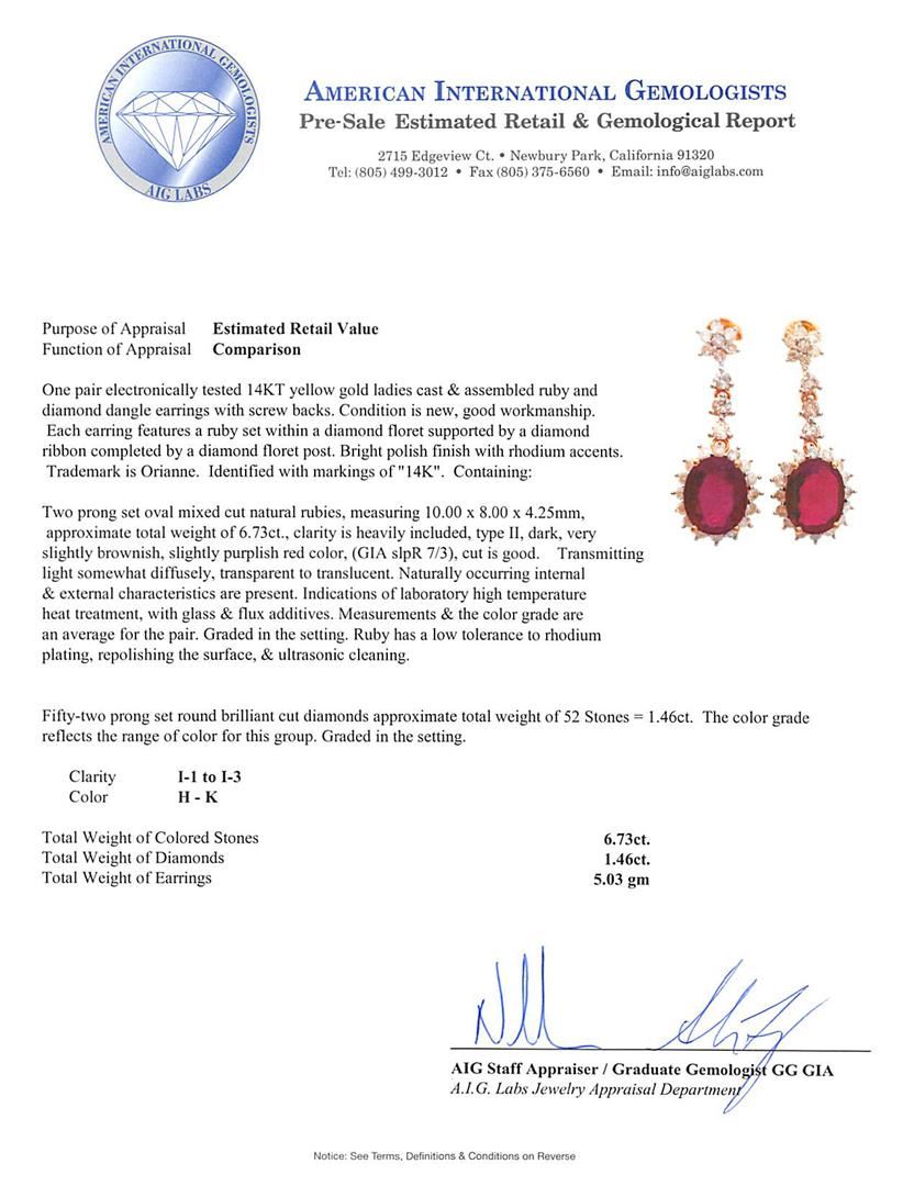 One pair electronically tested 14KT yellow gold ladies cast & assembled ruby and diamond dangle earrings with screw backs. Each earring features a ruby set within a diamond floret supported by a diamond ribbon completed by a diamond floret post. Bright polish finish with rhodium accents. Trademark is Orianne. Identified with markings of "14K". Condition is new, good workmanship. Containing: Two prong set oval mixed cut natural rubies, measuring 10.00 x 8.00 x 4.25mm, approximate total weight of 6.73ct., clarity is heavily included, type II, dark, very slightly brownish, slightly purplish red color, (GIA slpR 7/3), cut is good. Transmitting light somewhat diffusely, transparent to translucent. Naturally occurring internal & external characteristics are present. Indications of laboratory high temperature heat treatment, with glass & flux additives. Measurements & the color grade are an average for the pair. Graded in the setting. Ruby has a low tolerance to rhodium plating, repolishing the surface, & ultrasonic cleaning. Fifty-Two prong set round brilliant cut diamonds approximate total weight of 52 Stones = 1.46ct. The color grade reflects the range of color for this group. Graded in the setting. Clarity: I-1 to I-3. Color: H - K. Total Weight of Colored Stones 6.73ct. Total Weight of Diamonds 1.46ct. Total Weight of Earrings 5.03gm. AIG Appraised.