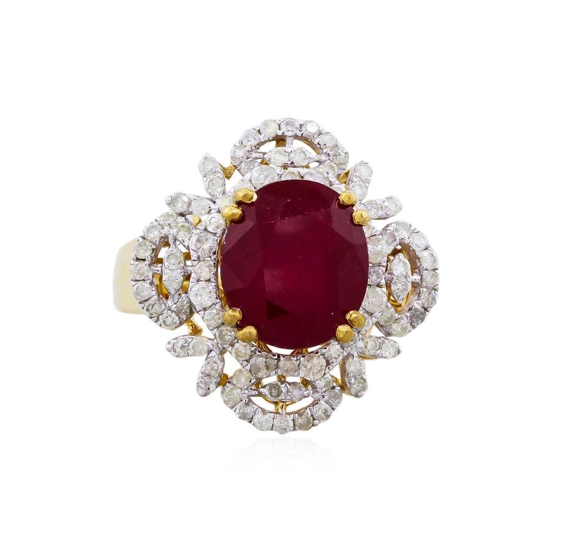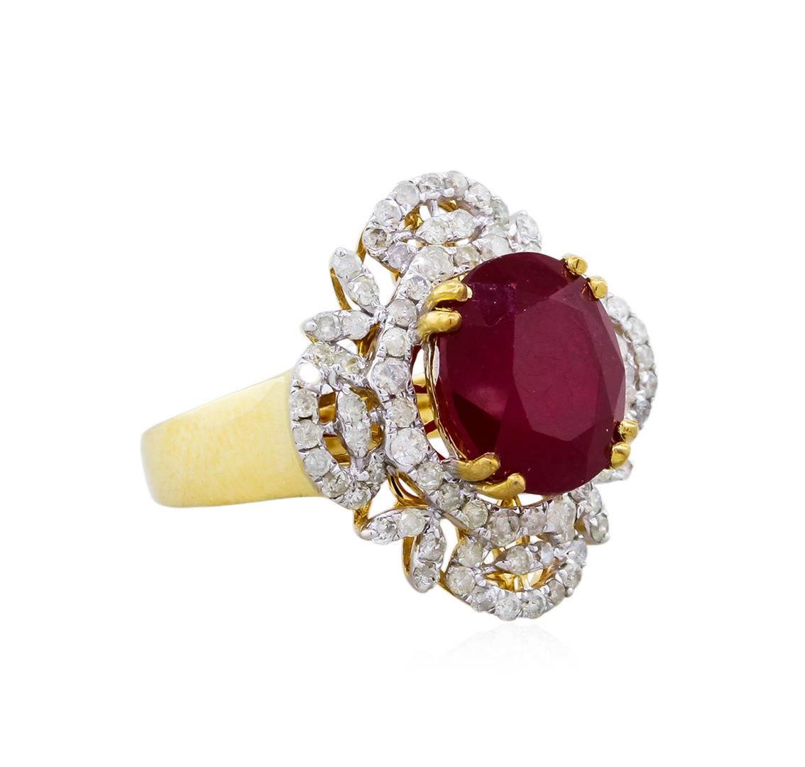 14KT yellow gold ruby and diamond ring. An oval cut ruby corundum gemstone weighing in at an aproximate 6.74 carats is prong mounted in the center of the ring. Approximately 0.97 carats of round brilliant cut diamonds accent the ring around the center gemstones and create a beautiful ornate design. The ring is cast stamped "14K" and has a gross weight of 6.0 grams. Finish: High polish. Condition: Excellent GGA Appraised at $5,050.00.