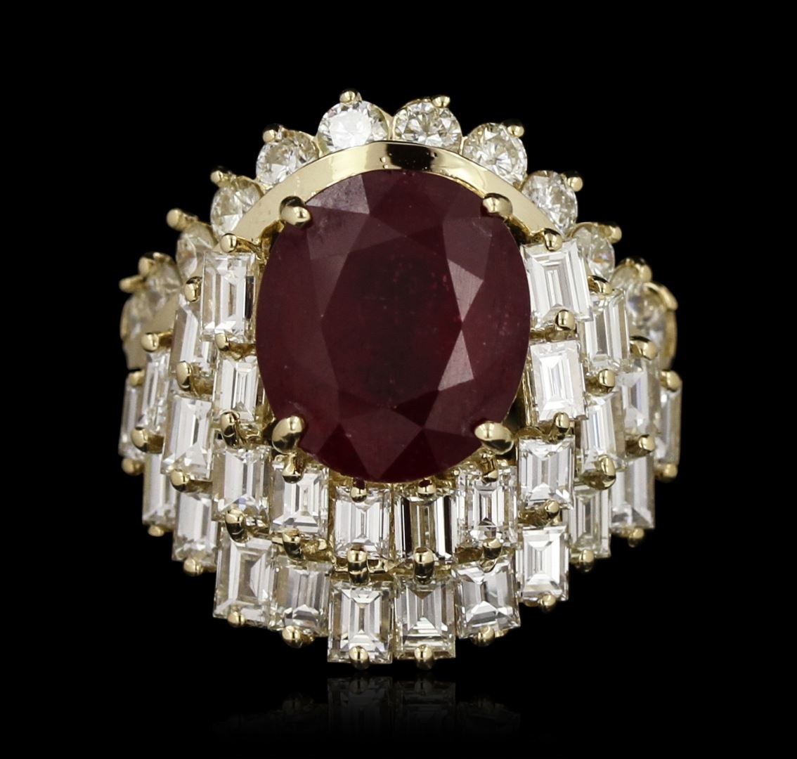 One polished, stamped, and electronically tested solid 14K yellow gold ring mounted with: 1 genuine ruby center stone weighing 6.78 carats, 28 genuine baguette cut diamonds weighing 3.42 carats, and 12 genuine round diamonds weighing 0.72 carats. This item weighs 10.3 grams, condition is new, excellent workmanship. AIGL Appraised at $17,850.00.