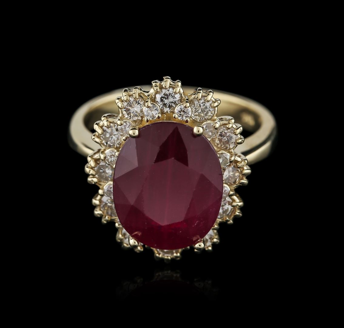 One electronically tested 14KT yellow gold ladies cast ruby and diamond ring with a bright polish finish. Identified with markings of "K14". Condition is new. Containing: One prong set oval modified brilliant cut natural ruby, measuring 12.26 x 10.10 x 6.57mm, approximate weight of 6.83ct., clarity is slightly included, type II, medium dark, moderately strong, strongly purplish red color, (GIA stpR 6/4), cut is good. Twelve prong set round brilliant cut diamonds, measuring 1.30 - 1.30 x 0.78mm (depth est.) approximate total weight of 12 Stones = 0.10ct. Clarity: SI-1 to SI-2. Color: K - L, Cut is Good. Twelve prong set round brilliant cut diamonds, measuring 2.50 - 2.50 x 1.50mm (depth est.) approximate total weight of 12 Stones = 0.69ct. Clarity: SI-1 to SI-2. Color: J - K, Cut is Good. All diamonds and colored gemstones are graded in the mounting, unless otherwise stated. Colored gemstones are presumed to have been subjected to commonly used enhancement processes. Total Weight of Colored Stones 6.83ct. Total Weight of Diamonds 0.78ct. Total Weight of Ring 6.50 grams. GGL Appraised at $3,350.00.