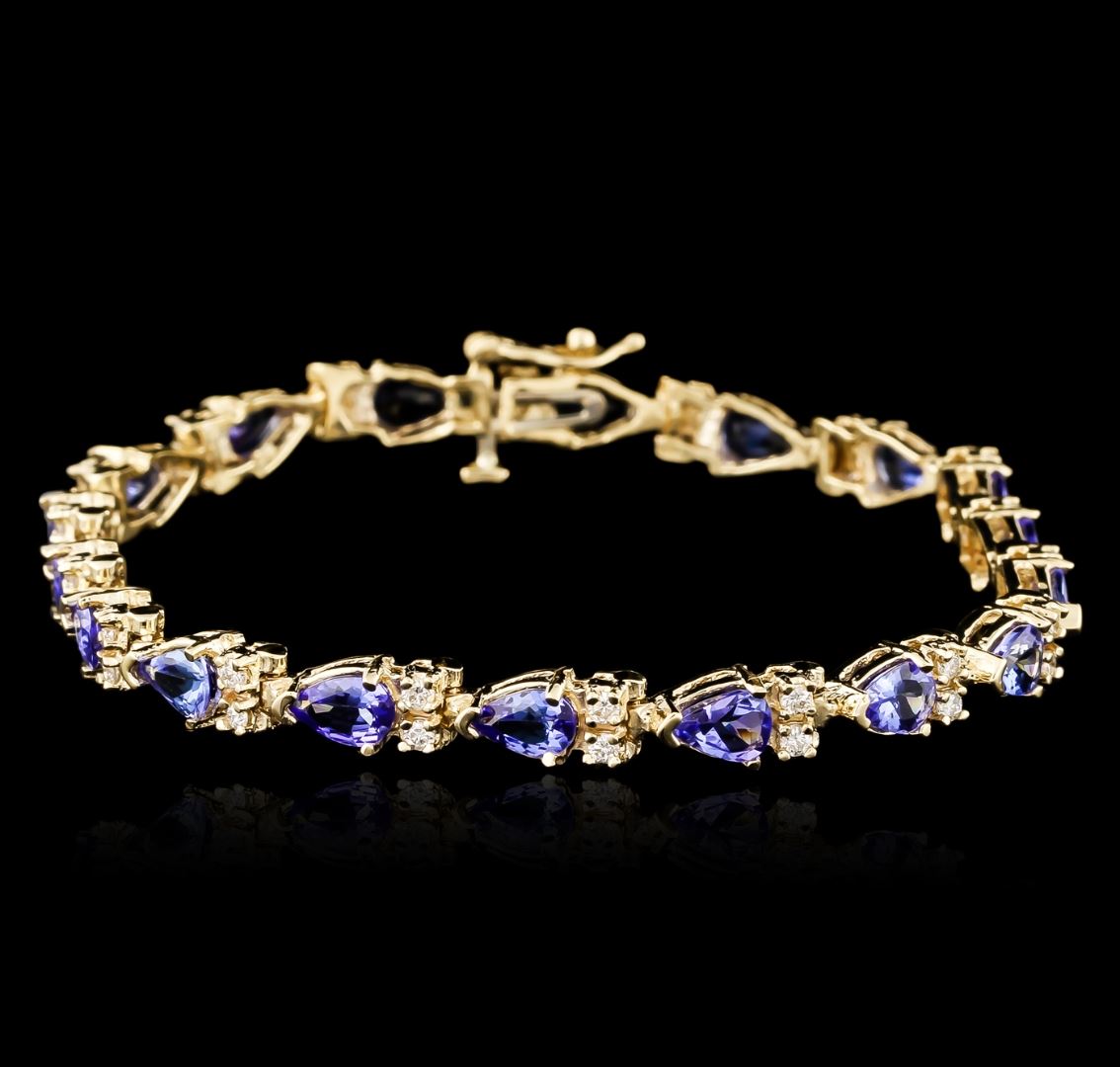 One electronically tested 14KT yellow gold ladies cast tanzanite and diamond bracelet with a hidden box clasp with safety closer with a bright polish finish. Measurements: 7" in length. Identified with markings of "14K". Condition is new. Containing: Eighteen prong set pear modified brilliant cut natural tanzanites, measuring 6.00. x 3.80 x 2.47mm, approximate total weight of 6.84ct., clarity is eye clean, type I, medium light, very slightly grayish, violet color, (GIA V 4/3), cut is good. Thirty-Six prong set round brilliant cut diamonds, measuring 1.30 - 1.30 x 0.78mm (depth est.) approximate total weight of 36 Stones = 0.29ct. Clarity: SI-2 to I-1. Color: I - J, Cut is Good. Colored gemstones are presumed to have been subjected to commonly used enhancement processes. All diamonds and colored gemstones are graded in the mounting, unless otherwise stated. Total Weight of Colored Stones 6.84ct. Total Weight of Diamonds 0.29ct. Total Weight of Bracelet 13.10 grams. GGL Appraised at $4,010.00.