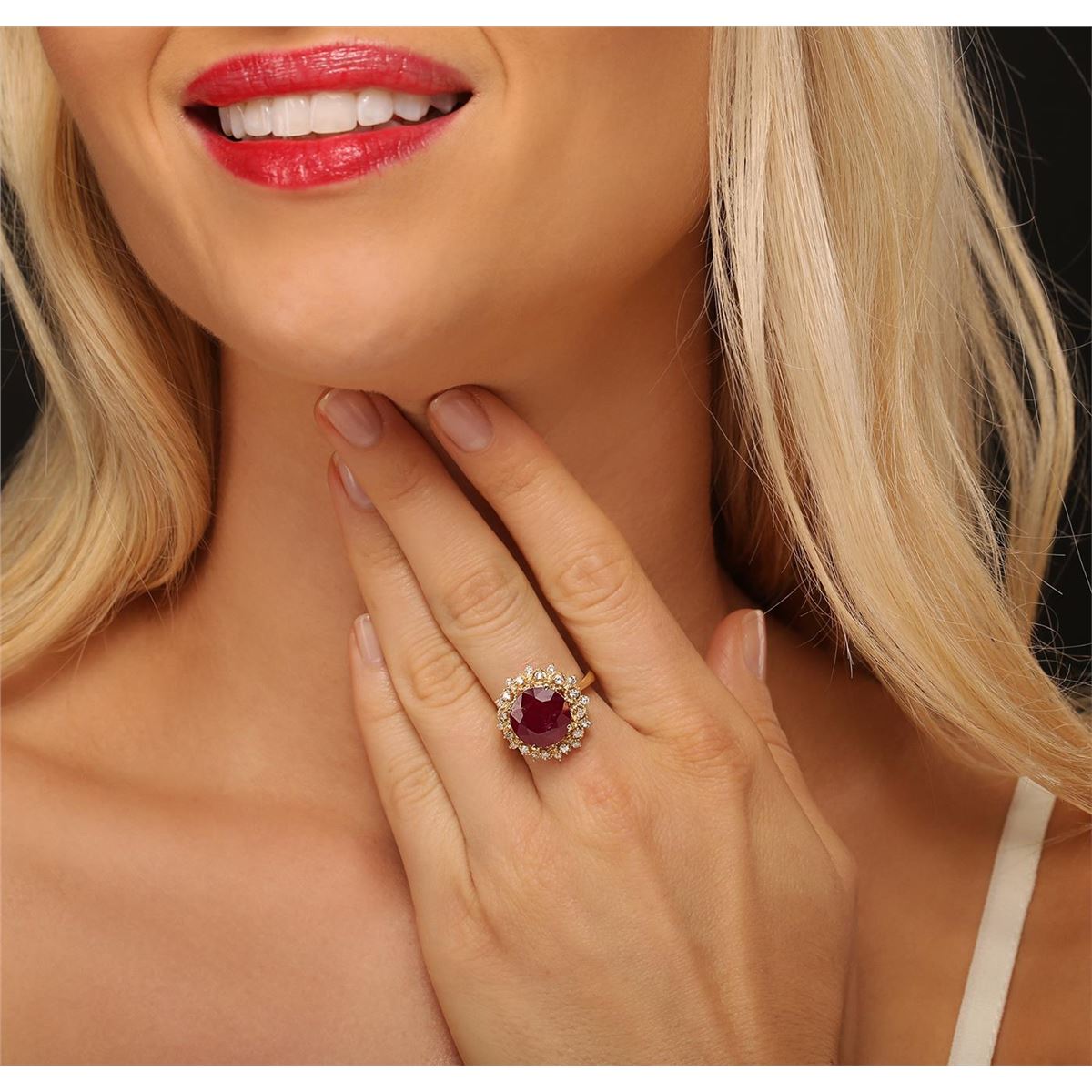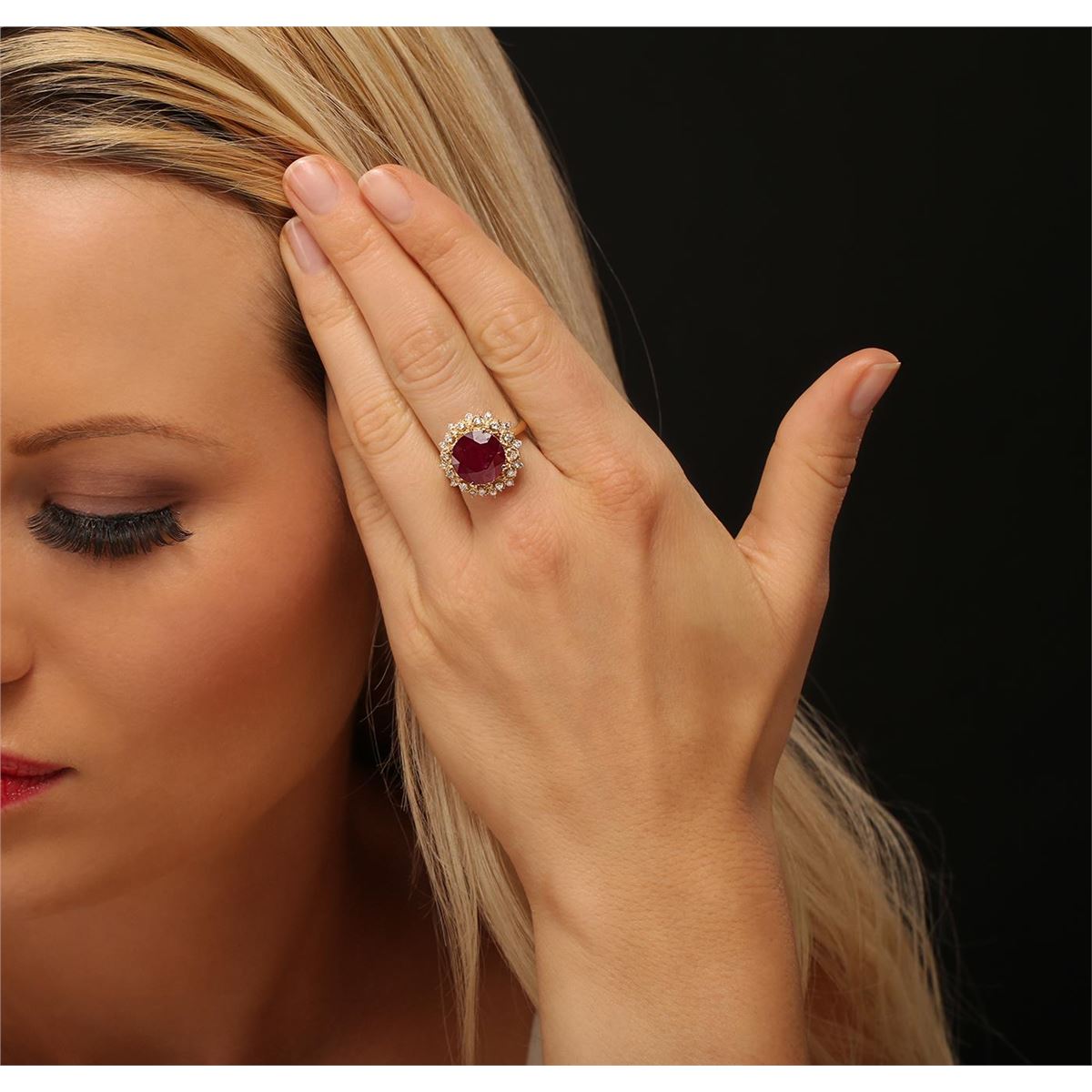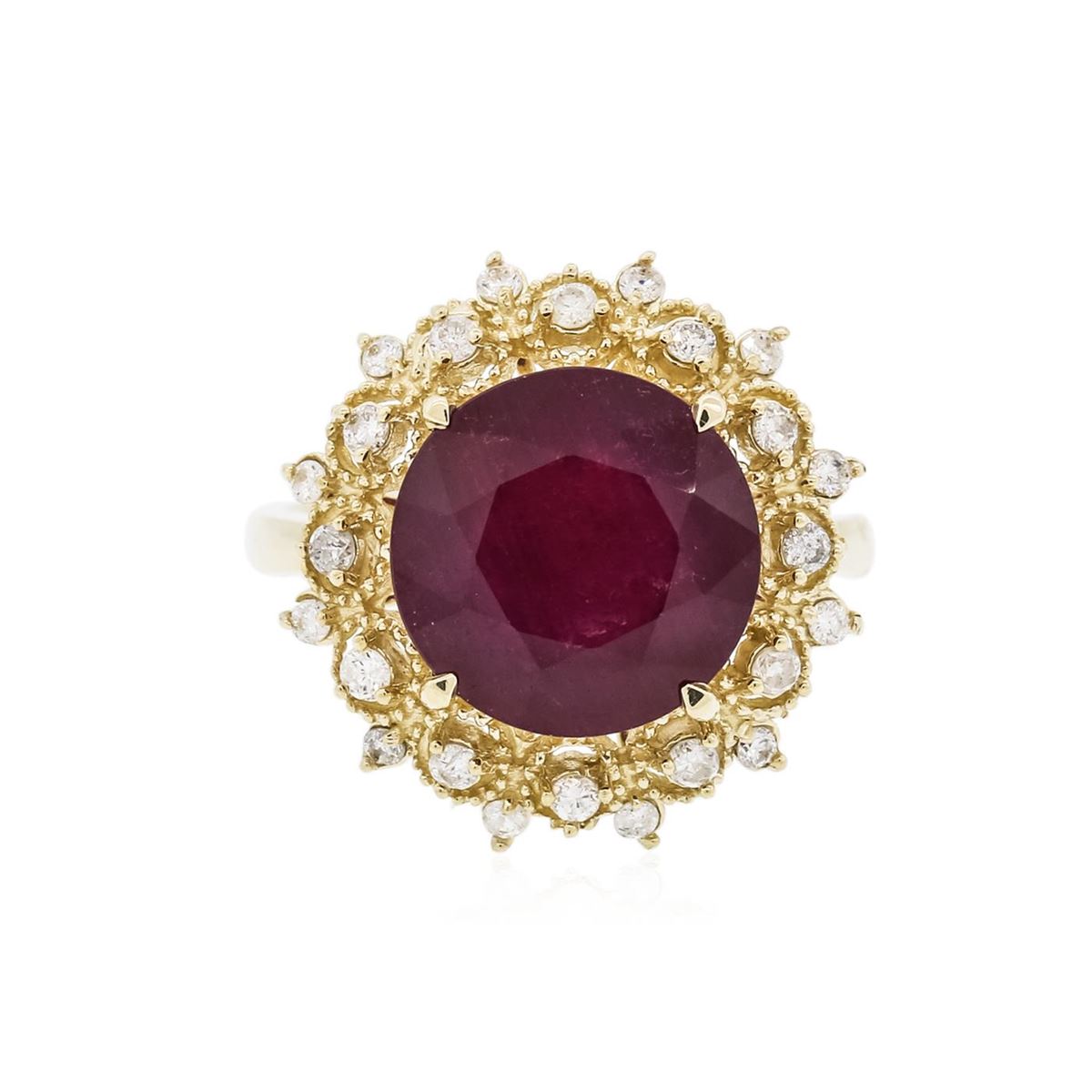 One electronically tested 14KT yellow gold ladies cast ruby and diamond ring. The featured ruby is set within a stylized floret bezel, completed by a two and one-half millimeter wide band. Bright polish finish with milgrain detailing. Identified with markings of "K14". Condition is new, good workmanship. Containing: One prong set round brilliant cut natural ruby, measuring 11.40 - 11.40 x 6.60 mm, approximate weight of 6.86ct., clarity is heavily included, type II, medium dark, very slightly brownish, slightly purplish red color, (GIA slpR 6/3), cut is good. Transmitting light somewhat diffusely, transparent to translucent. Naturally occurring internal & external characteristics are present. Indications of laboratory high temperature heat treatment, with glass & flux additives. Graded in the setting. Ruby has a low tolerance to rhodium plating, repolishing the surface, & ultrasonic cleaning. Twenty-Four prong set round brilliant cut diamonds, measuring 1.70 - 1.60 x 0.99mm (depth est.) approximate total weight of 24 Stones = 0.49ct. Graded in the setting. Clarity: SI-1 to I-1 . Color: G - I. Total Weight of Colored Stones 6.86ct. Total Weight of Diamonds 0.49ct. Total Weight of Ring 6.27 grams. AIG Appraised at $3,870.00.