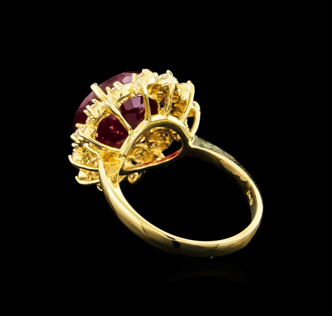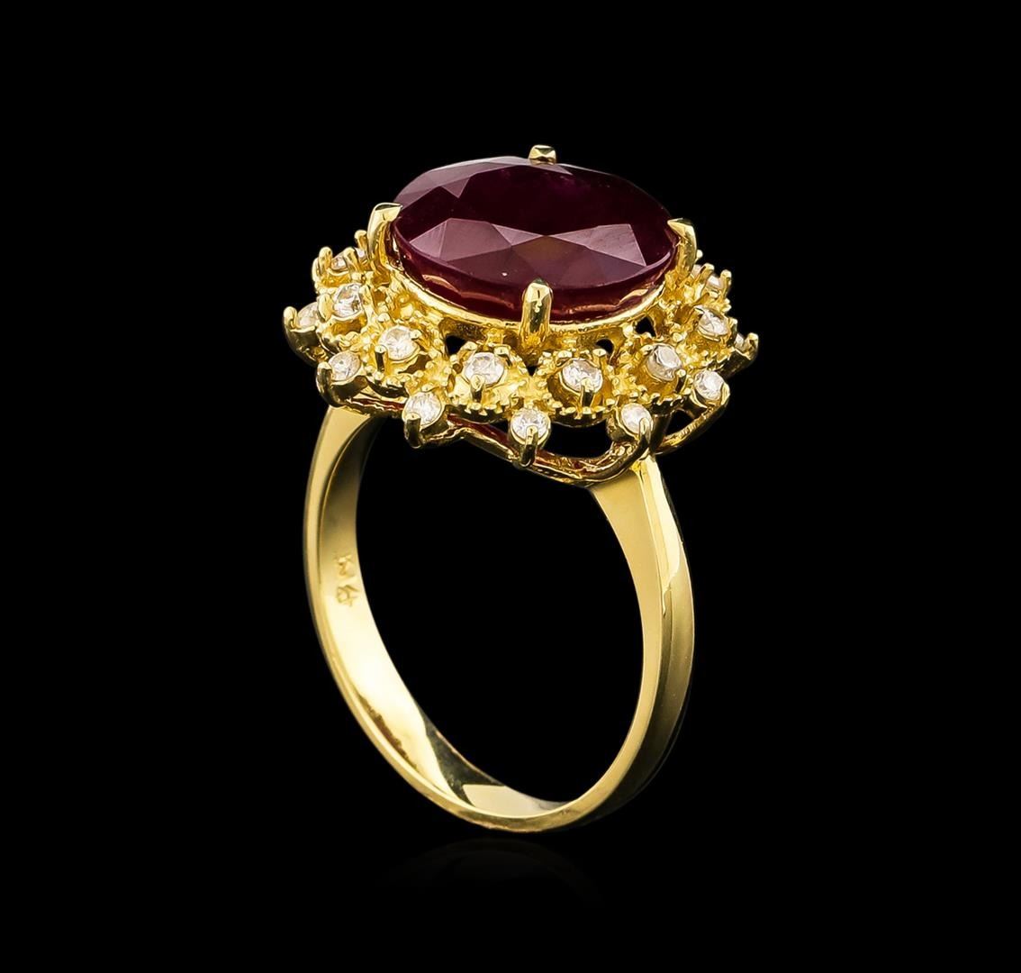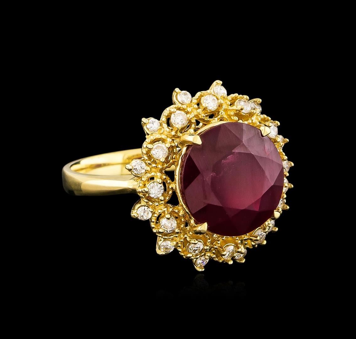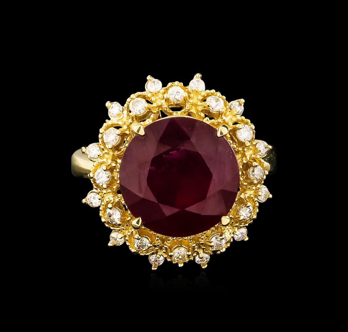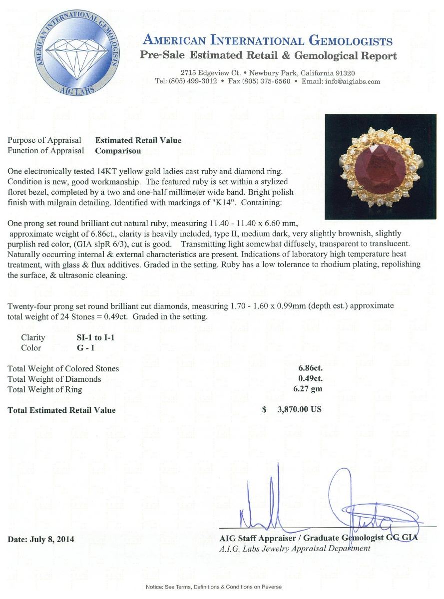 One electronically tested 14KT yellow gold ladies cast ruby and diamond ring. The featured ruby is set within a stylized floret bezel, completed by a two and one-half millimeter wide band. Bright polish finish with milgrain detailing. Identified with markings of "K14". Condition is new, good workmanship. Containing: One prong set round brilliant cut natural ruby, measuring 11.40 - 11.40 x 6.60 mm, approximate weight of 6.86ct., clarity is heavily included, type II, medium dark, very slightly brownish, slightly purplish red color, (GIA slpR 6/3), cut is good. Transmitting light somewhat diffusely, transparent to translucent. Naturally occurring internal & external characteristics are present. Indications of laboratory high temperature heat treatment, with glass & flux additives. Graded in the setting. Ruby has a low tolerance to rhodium plating, repolishing the surface, & ultrasonic cleaning. Twenty-Four prong set round brilliant cut diamonds, measuring 1.70 - 1.60 x 0.99mm (depth est.) approximate total weight of 24 Stones = 0.49ct. Graded in the setting. Clarity: SI-1 to I-1 . Color: G - I. Total Weight of Colored Stones 6.86ct. Total Weight of Diamonds 0.49ct. Total Weight of Ring 6.27 grams. AIG Appraised at $3,870.00.
