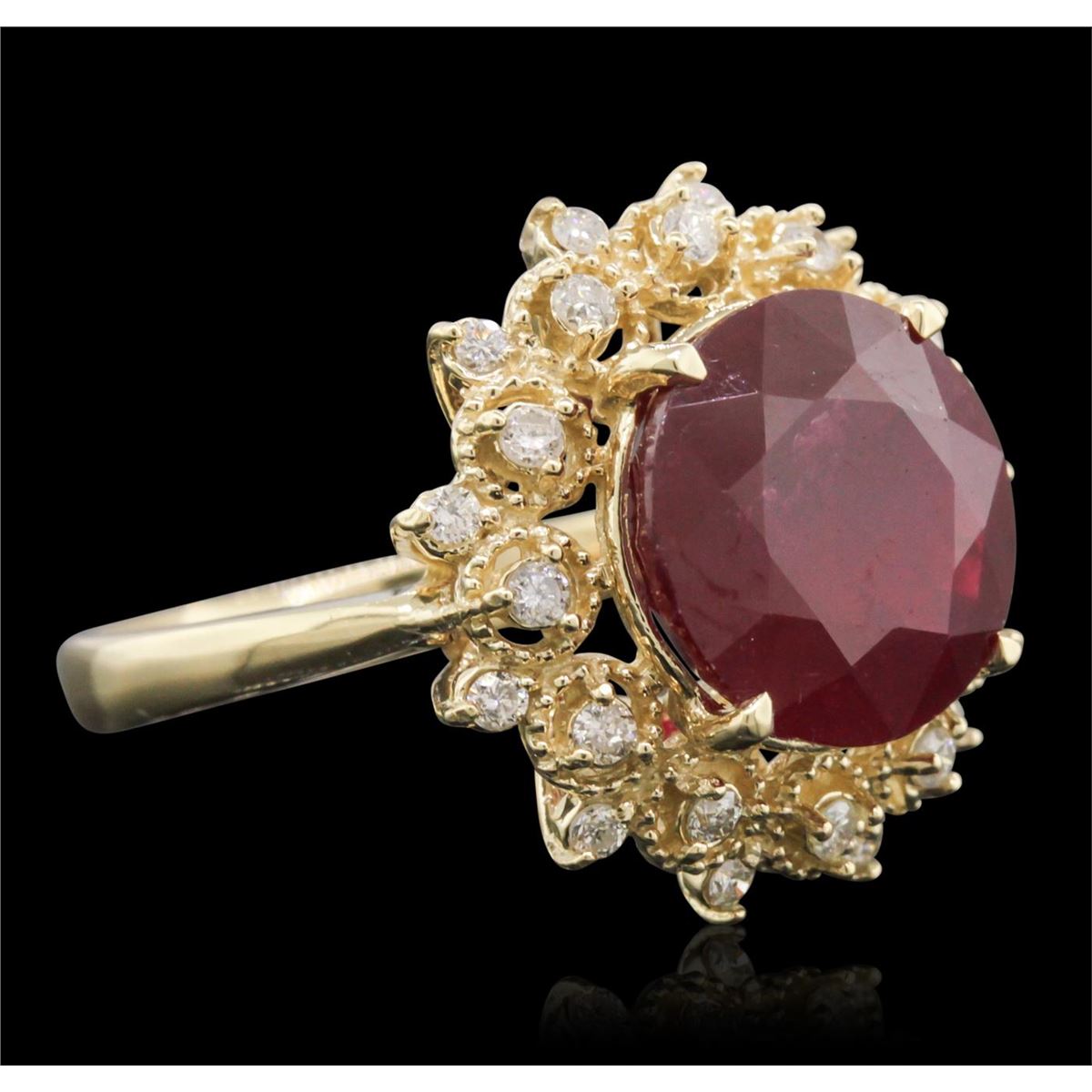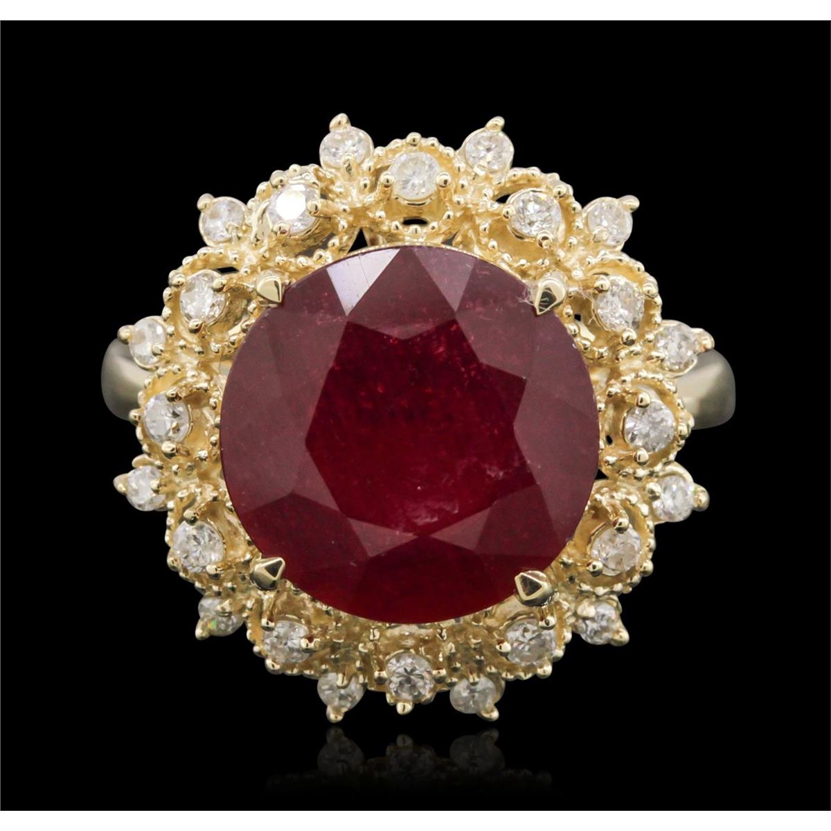 One electronically tested 14KT yellow gold ladies cast ruby and diamond ring. The featured ruby is set within a stylized floret bezel, completed by a two and one-half millimeter wide band. Bright polish finish with milgrain detailing. Identified with markings of "K14". Condition is new, good workmanship. Containing: One prong set round brilliant cut natural ruby, measuring 11.40 - 11.40 x 6.60 mm, approximate weight of 6.86ct., clarity is heavily included, type II, medium dark, very slightly brownish, slightly purplish red color, (GIA slpR 6/3), cut is good. Transmitting light somewhat diffusely, transparent to translucent. Naturally occurring internal & external characteristics are present. Indications of laboratory high temperature heat treatment, with glass & flux additives. Graded in the setting. Ruby has a low tolerance to rhodium plating, repolishing the surface, & ultrasonic cleaning. Twenty-Four prong set round brilliant cut diamonds, measuring 1.70 - 1.60 x 0.99mm (depth est.) approximate total weight of 24 Stones = 0.49ct. Graded in the setting. Clarity: SI-1 to I-1 . Color: G - I. Total Weight of Colored Stones 6.86ct. Total Weight of Diamonds 0.49ct. Total Weight of Ring 6.27 grams. AIG Appraised at $3,870.00.