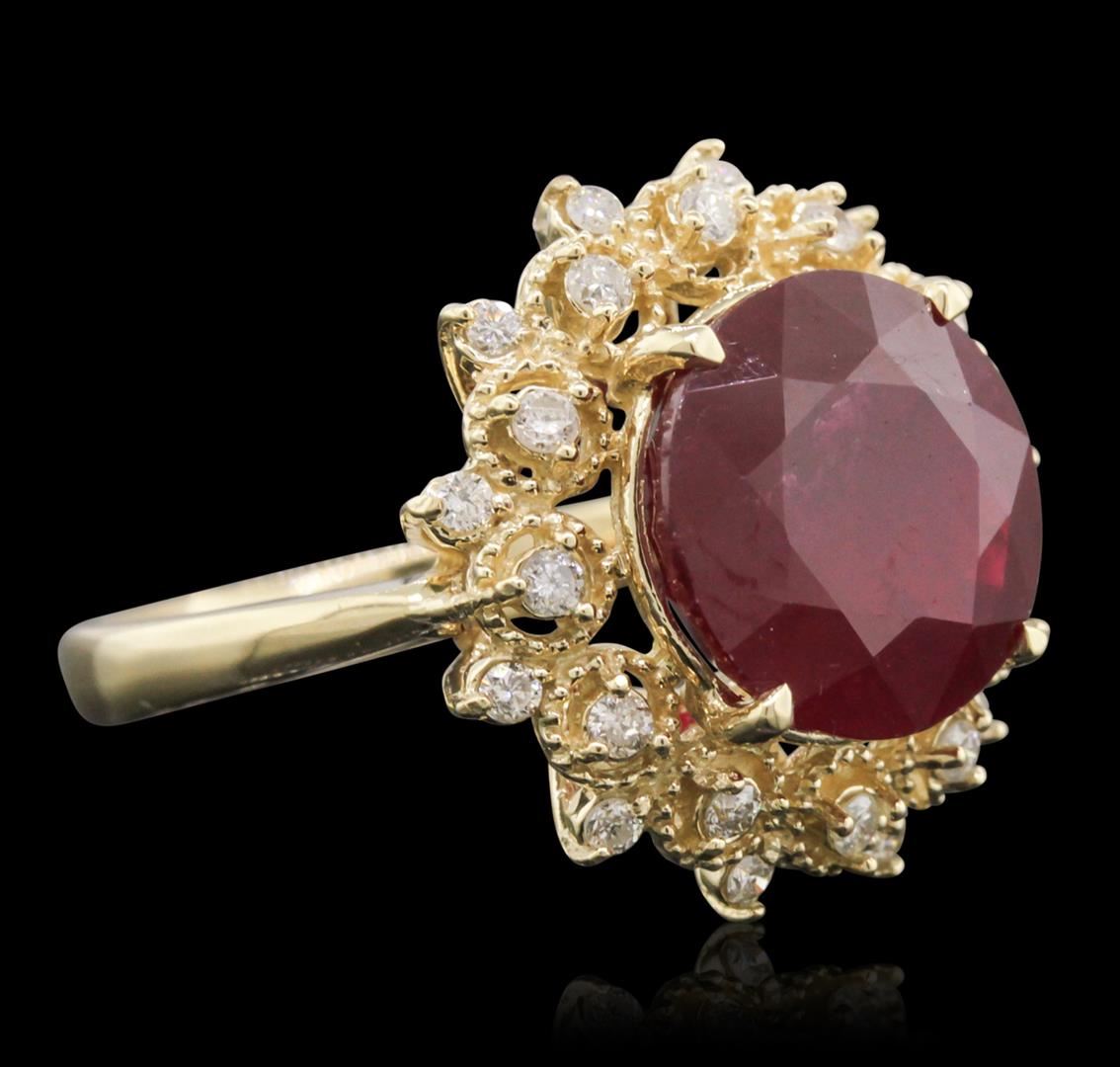 One electronically tested 14KT yellow gold ladies cast ruby and diamond ring. The featured ruby is set within a stylized floret bezel, completed by a two and one-half millimeter wide band. Bright polish finish with milgrain detailing. Identified with markings of "K14". Condition is new, good workmanship. Containing: One prong set round brilliant cut natural ruby, measuring 11.40 - 11.40 x 6.60 mm, approximate weight of 6.86ct., clarity is heavily included, type II, medium dark, very slightly brownish, slightly purplish red color, (GIA slpR 6/3), cut is good. Transmitting light somewhat diffusely, transparent to translucent. Naturally occurring internal & external characteristics are present. Indications of laboratory high temperature heat treatment, with glass & flux additives. Graded in the setting. Ruby has a low tolerance to rhodium plating, repolishing the surface, & ultrasonic cleaning. Twenty-Four prong set round brilliant cut diamonds, measuring 1.70 - 1.60 x 0.99mm (depth est.) approximate total weight of 24 Stones = 0.49ct. Graded in the setting. Clarity: SI-1 to I-1 . Color: G - I. Total Weight of Colored Stones 6.86ct. Total Weight of Diamonds 0.49ct. Total Weight of Ring 6.27 grams. AIG Appraised at $3,870.00.