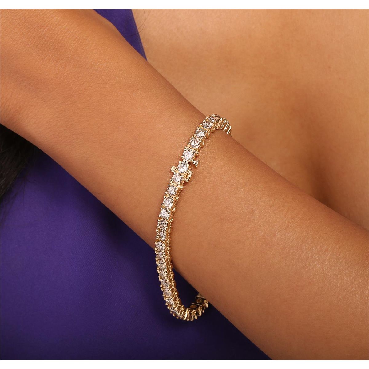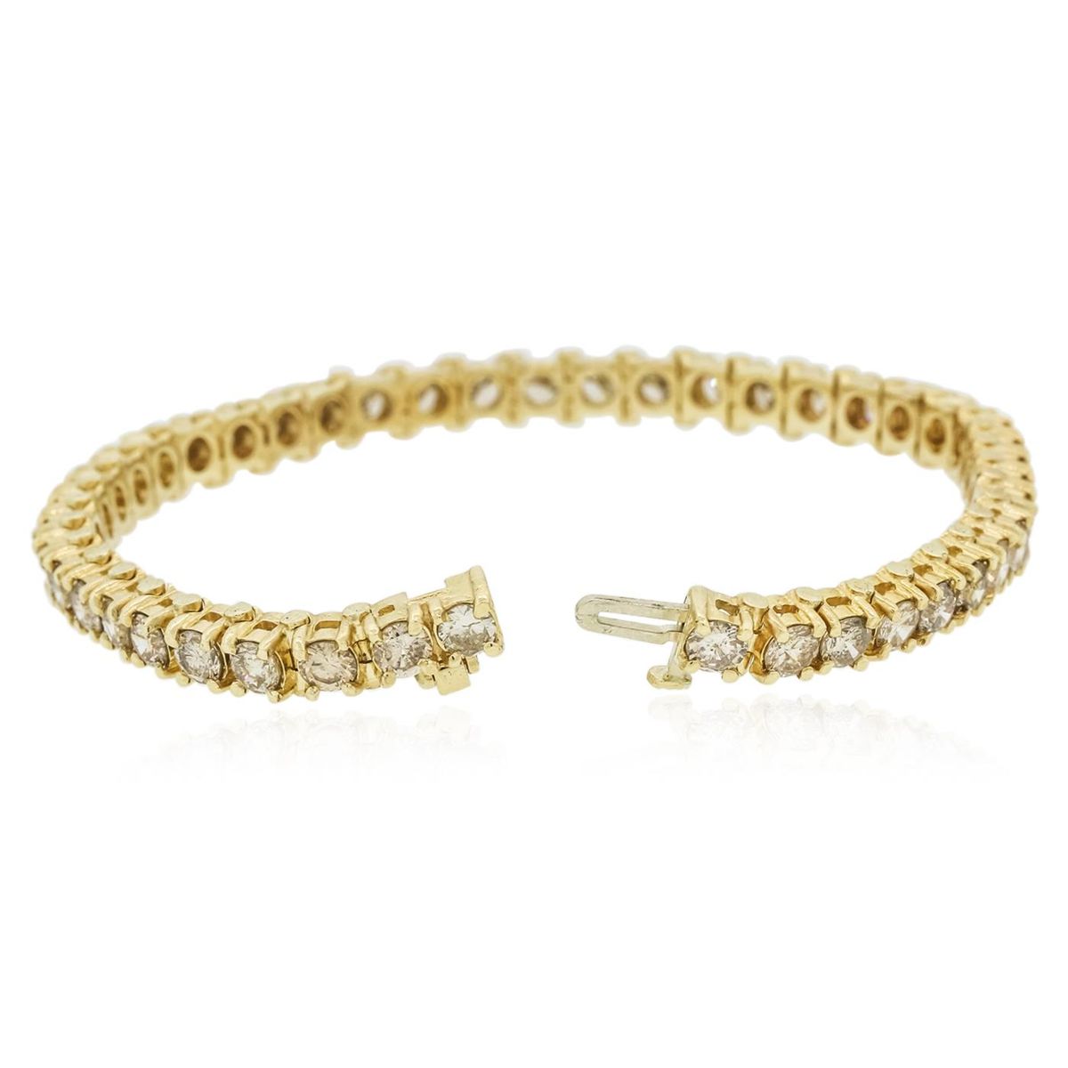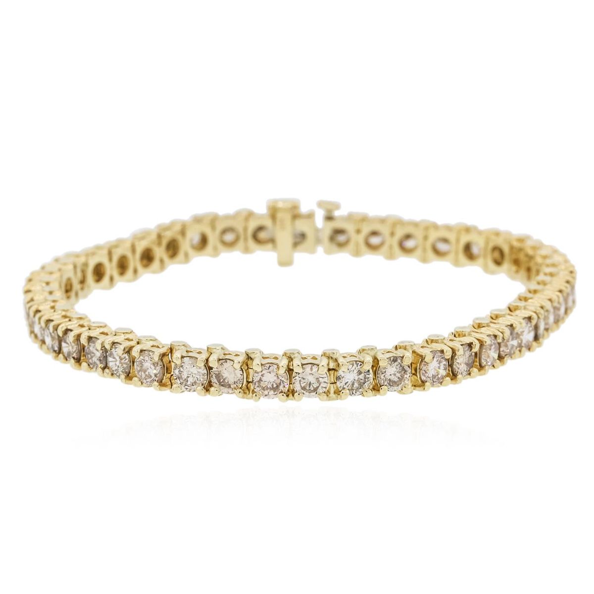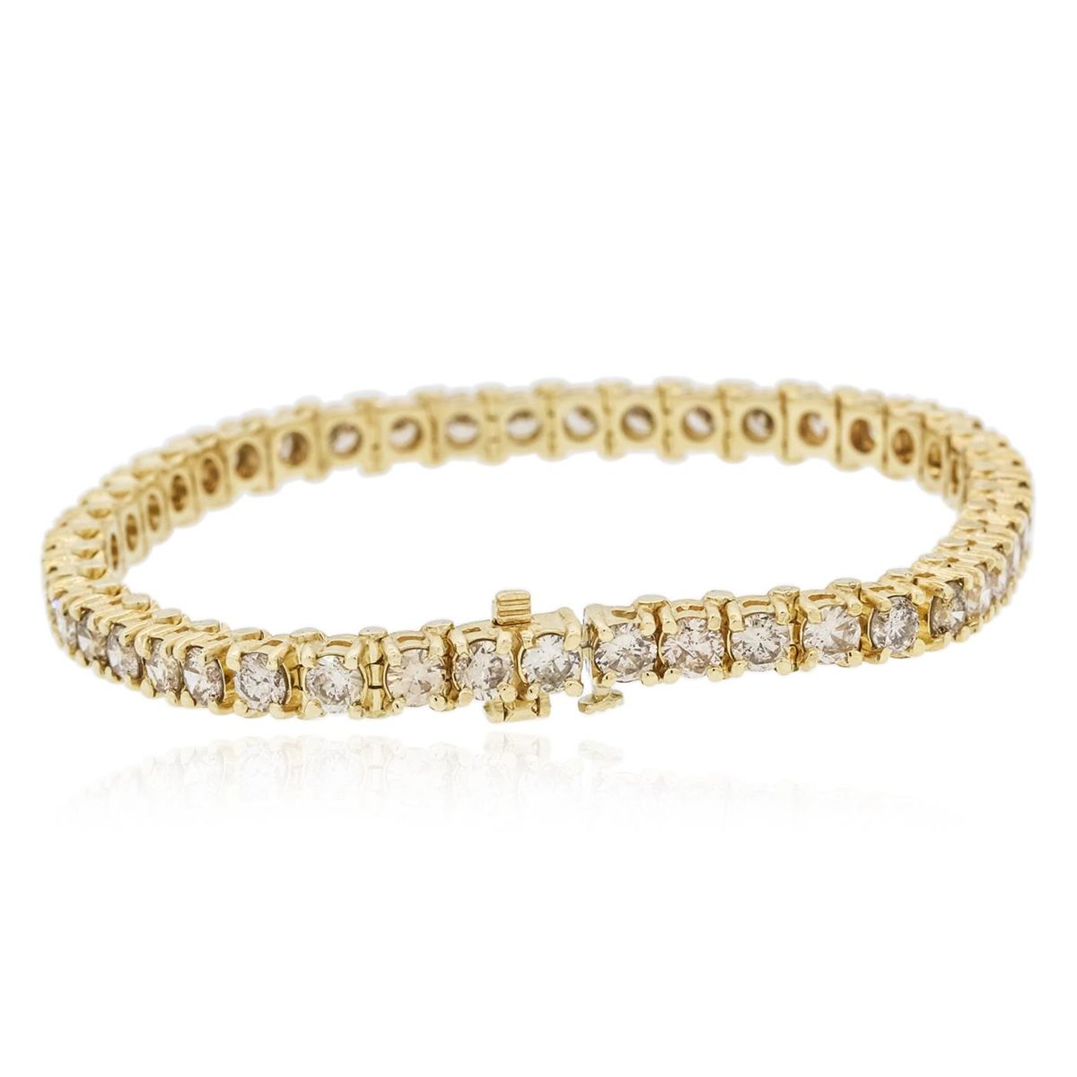 One electronically tested 14KT yellow gold ladies combination cast & assembled tennis bracelet with a hidden box clasp with a bright polish finish. Condition is new. Measurements: 7" in length. Identified with markings of "14K". Containing: Forty-Four prong set round brilliant cut diamonds, measuring 3.50 - 3.50 x 2.10mm (depth est.) approximate. Total Weight of 44 Stones = 6.90ct. Clarity: SI-2 to I-1. Color: L - M, Cut is Good. All diamonds are graded in the mounting, unless otherwise stated. Total Weight of Diamonds 6.90ct. Total Weight of Bracelet 20.50 grams. GGL Appraised at $20,495.00.