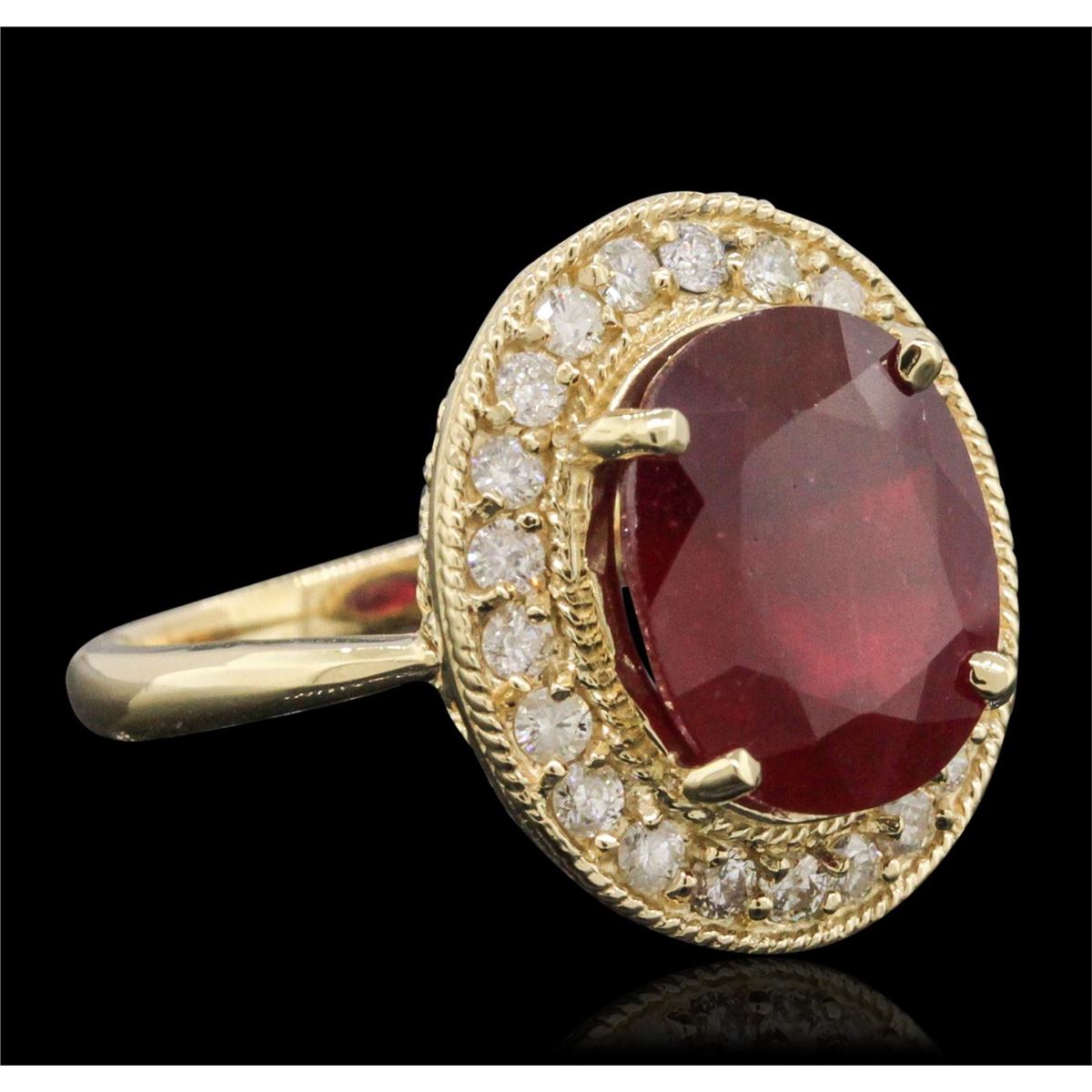 One electronically tested 14KT yellow gold ladies cast ruby and diamond ring. Condition is new, good workmanship. The featured ruby is set within a diamond bezel, completed by a two millimeter wide band. Bright polish finish with rope detailing. Identified with markings of "K14". Containing: One prong set oval mixed cut natural ruby, measuring 12.20 x 9.95 x 6.55mm, 8%. bulge factor, approximate weight of 6.94ct., clarity is heavily included, type II, dark, very slightly brownish, red color, (GIA R 7/3), cut is good. Transmitting light somewhat diffusely, transparent to translucent. Naturally occurring internal & external characteristics are present. Indications of laboratory high temperature heat treatment, with glass & flux additives. Graded in the setting. Ruby has a low tolerance to rhodium plating, repolishing the surface, & ultrasonic cleaning. Twenty prong set round brilliant cut diamonds, measuring 1.90 - 1.80 x 1.11mm (depth est.) approximate. Total Weight of 20 Stones = 0.56ct. Graded in the setting. Clarity: I-1 to I-2. Color: G - I. Total Weight of Colored Stones 6.94ct. Total Weight of Diamonds 0.56ct. Total Weight of Ring 7.29gm. AIG Appraised at $3,790.00.