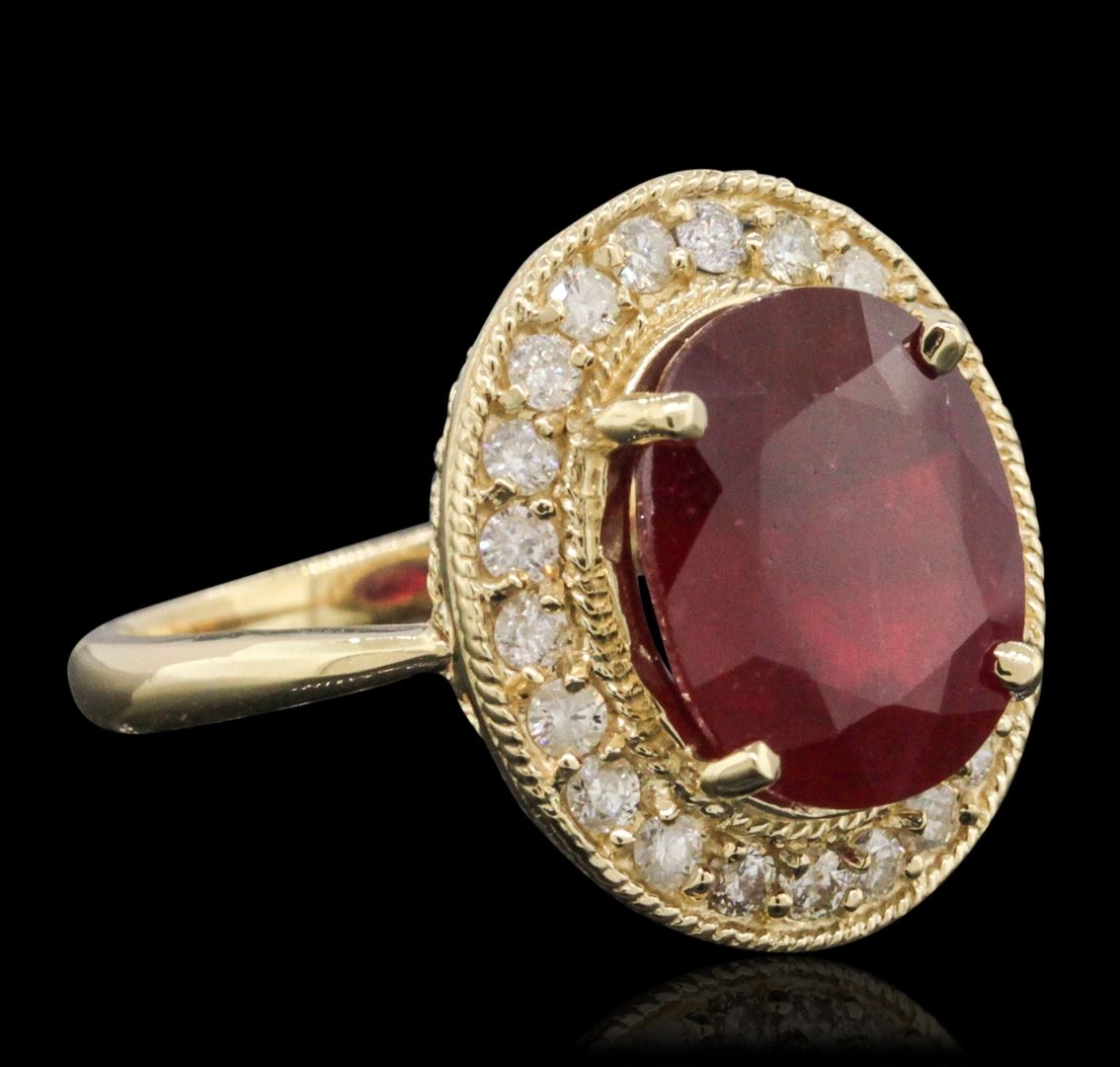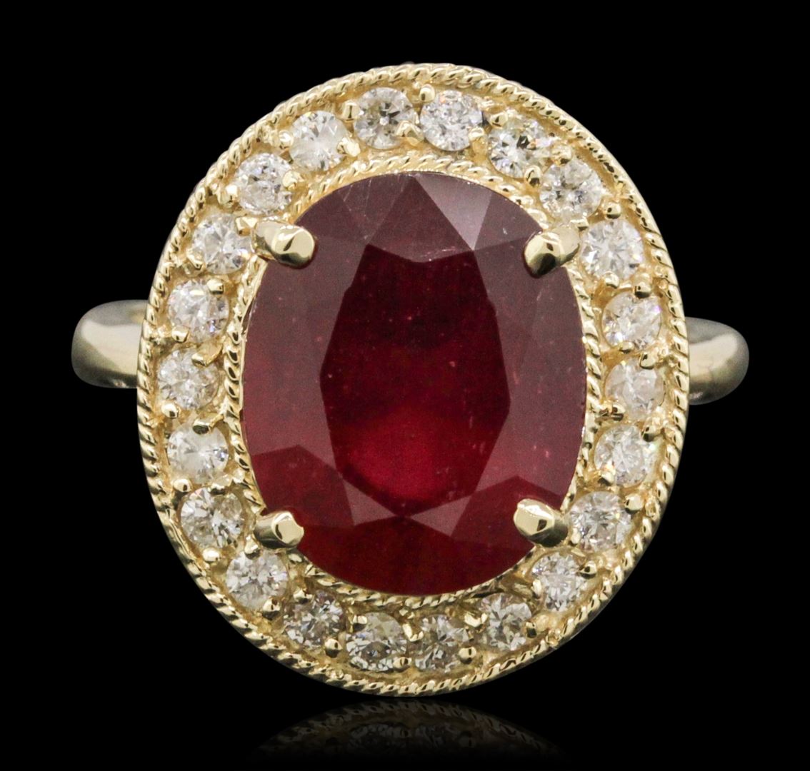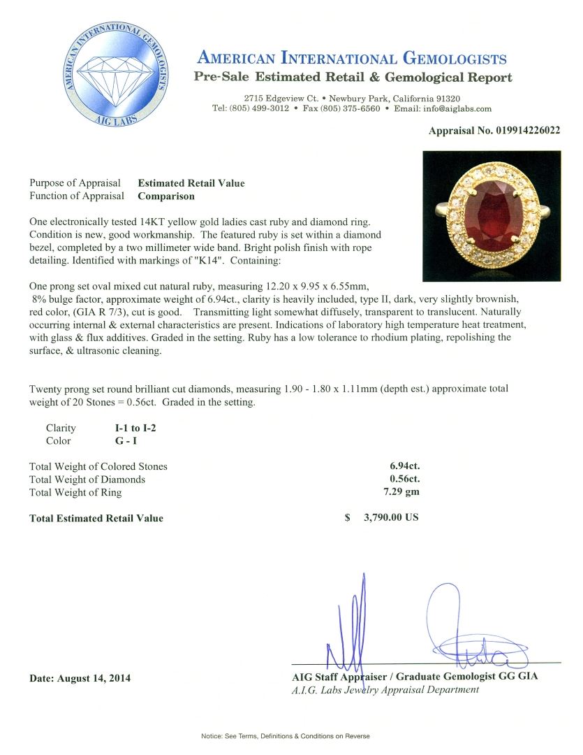 One electronically tested 14KT yellow gold ladies cast ruby and diamond ring. Condition is new, good workmanship. The featured ruby is set within a diamond bezel, completed by a two millimeter wide band. Bright polish finish with rope detailing. Identified with markings of "K14". Containing: One prong set oval mixed cut natural ruby, measuring 12.20 x 9.95 x 6.55mm, 8%. bulge factor, approximate weight of 6.94ct., clarity is heavily included, type II, dark, very slightly brownish, red color, (GIA R 7/3), cut is good. Transmitting light somewhat diffusely, transparent to translucent. Naturally occurring internal & external characteristics are present. Indications of laboratory high temperature heat treatment, with glass & flux additives. Graded in the setting. Ruby has a low tolerance to rhodium plating, repolishing the surface, & ultrasonic cleaning. Twenty prong set round brilliant cut diamonds, measuring 1.90 - 1.80 x 1.11mm (depth est.) approximate. Total Weight of 20 Stones = 0.56ct. Graded in the setting. Clarity: I-1 to I-2. Color: G - I. Total Weight of Colored Stones 6.94ct. Total Weight of Diamonds 0.56ct. Total Weight of Ring 7.29gm. AIG Appraised at $3,790.00.