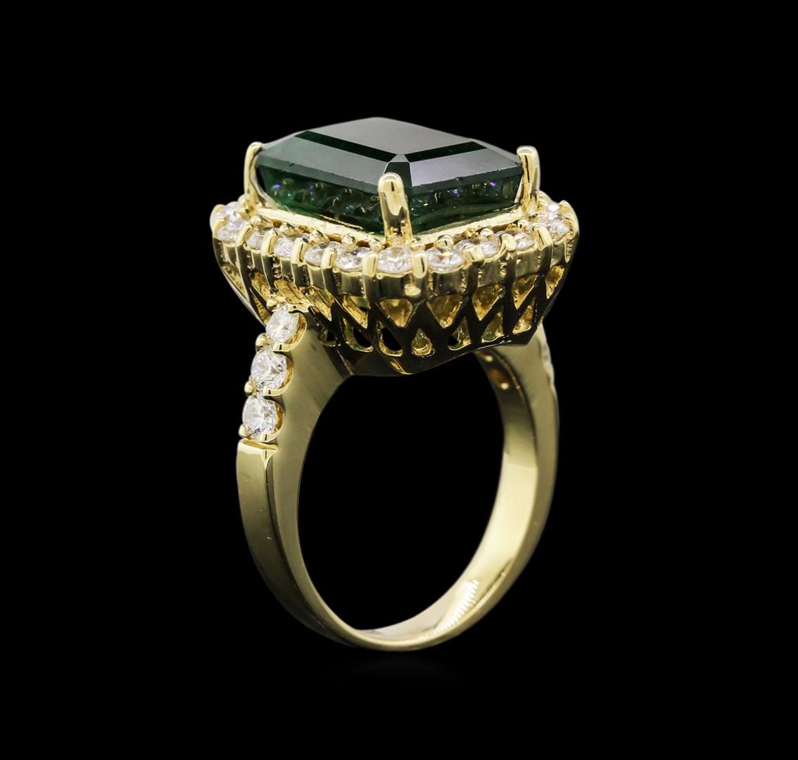 One electronically tested 14KT yellow gold ladies cast emerald and diamond ring with a bright polish finish. Identified with markings of "K14". Condition is new. Containing: One prong set emerald standard step cut natural emerald, measuring 13.40 x 10.40 x 6.80mm, approximate weight of 6.96ct., clarity is severely included, type III, dark, moderately strong, green color, (GIA G 7/4), cut is good. Twenty-Eight prong set round brilliant cut diamonds, measuring 2.50 - 2.50 x 1.50mm (depth est.) approximate total weight of 28 Stones = 1.60ct. Clarity: SI-1. Color: G - H, Cut is Good. Colored gemstones are presumed to have been subjected to commonly used enhancement processes. All diamonds and colored gemstones are graded in the mounting, unless otherwise stated. Total Weight of Colored Stones 6.96ct. Total Weight of Diamonds 1.60ct. Total Weight of Ring 11.30 grams. GGL Appraised at $9,130.00.