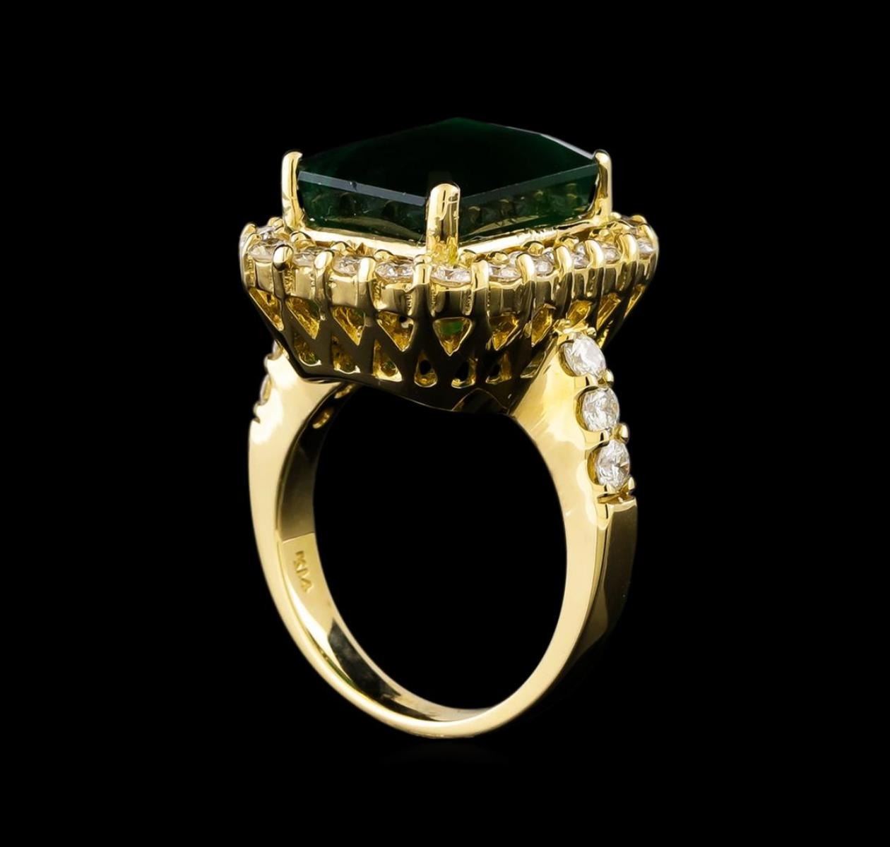 One electronically tested 14KT yellow gold ladies cast emerald and diamond ring with a bright polish finish. Identified with markings of "K14". Condition is new. Containing: One prong set emerald standard step cut natural emerald, measuring 13.40 x 10.40 x 6.80mm, approximate weight of 6.96ct., clarity is severely included, type III, dark, moderately strong, green color, (GIA G 7/4), cut is good. Twenty-Eight prong set round brilliant cut diamonds, measuring 2.50 - 2.50 x 1.50mm (depth est.) approximate total weight of 28 Stones = 1.60ct. Clarity: SI-1. Color: G - H, Cut is Good. Colored gemstones are presumed to have been subjected to commonly used enhancement processes. All diamonds and colored gemstones are graded in the mounting, unless otherwise stated. Total Weight of Colored Stones 6.96ct. Total Weight of Diamonds 1.60ct. Total Weight of Ring 11.30 grams. GGL Appraised.