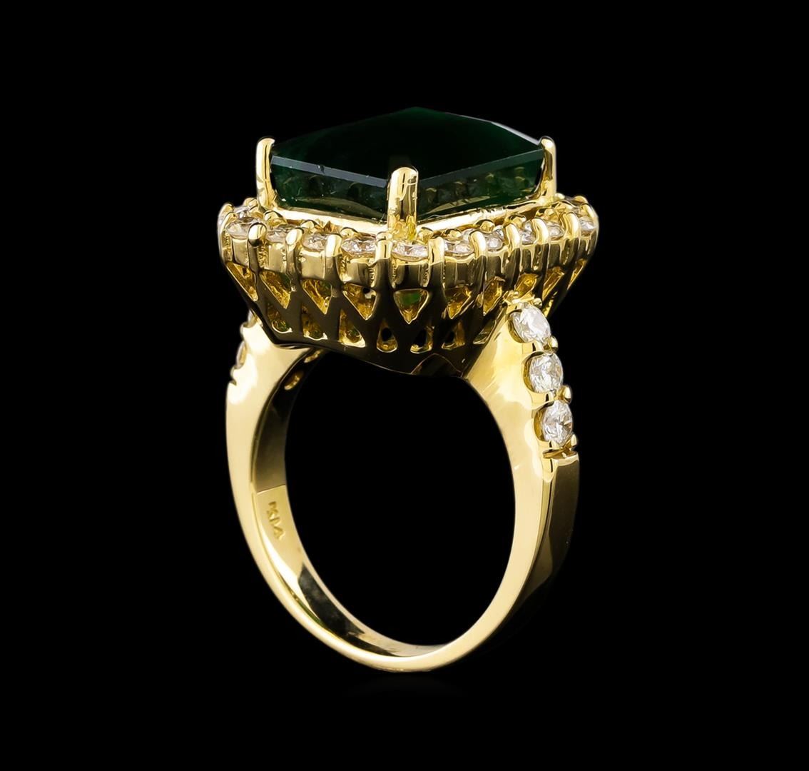 One electronically tested 14KT yellow gold ladies cast emerald and diamond ring with a bright polish finish. Identified with markings of "K14". Condition is new. Containing: One prong set emerald standard step cut natural emerald, measuring 13.40 x 10.40 x 6.80mm, approximate weight of 6.96ct., clarity is severely included, type III, dark, moderately strong, green color, (GIA G 7/4), cut is good. Twenty-Eight prong set round brilliant cut diamonds, measuring 2.50 - 2.50 x 1.50mm (depth est.) approximate total weight of 28 Stones = 1.60 ct. Clarity: SI-1. Color: G - H, Cut is Good. Colored gemstones are presumed to have been subjected to commonly used enhancement processes. All diamonds and colored gemstones are graded in the mounting, unless otherwise stated. Total Weight of Colored Stones 6.96ct. Total Weight of Diamonds 1.60 ct. Total Weight of Ring 11.30 grams. GGL Appraised.