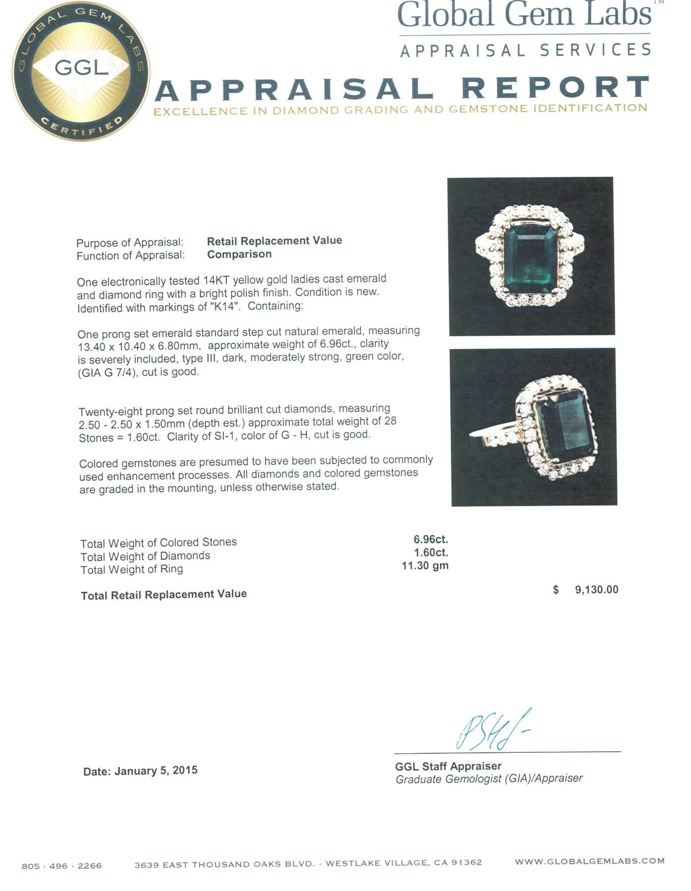 One electronically tested 14KT yellow gold ladies cast emerald and diamond ring with a bright polish finish. Identified with markings of "K14". Condition is new. Containing: One prong set emerald standard step cut natural emerald, measuring 13.40 x 10.40 x 6.80mm, approximate weight of 6.96ct., clarity is severely included, type III, dark, moderately strong, green color, (GIA G 7/4), cut is good. Twenty-Eight prong set round brilliant cut diamonds, measuring 2.50 - 2.50 x 1.50mm (depth est.) approximate total weight of 28 Stones = 1.60 ct. Clarity: SI-1. Color: G - H, Cut is Good. Colored gemstones are presumed to have been subjected to commonly used enhancement processes. All diamonds and colored gemstones are graded in the mounting, unless otherwise stated. Total Weight of Colored Stones 6.96ct. Total Weight of Diamonds 1.60 ct. Total Weight of Ring 11.30 grams. GGL Appraised.