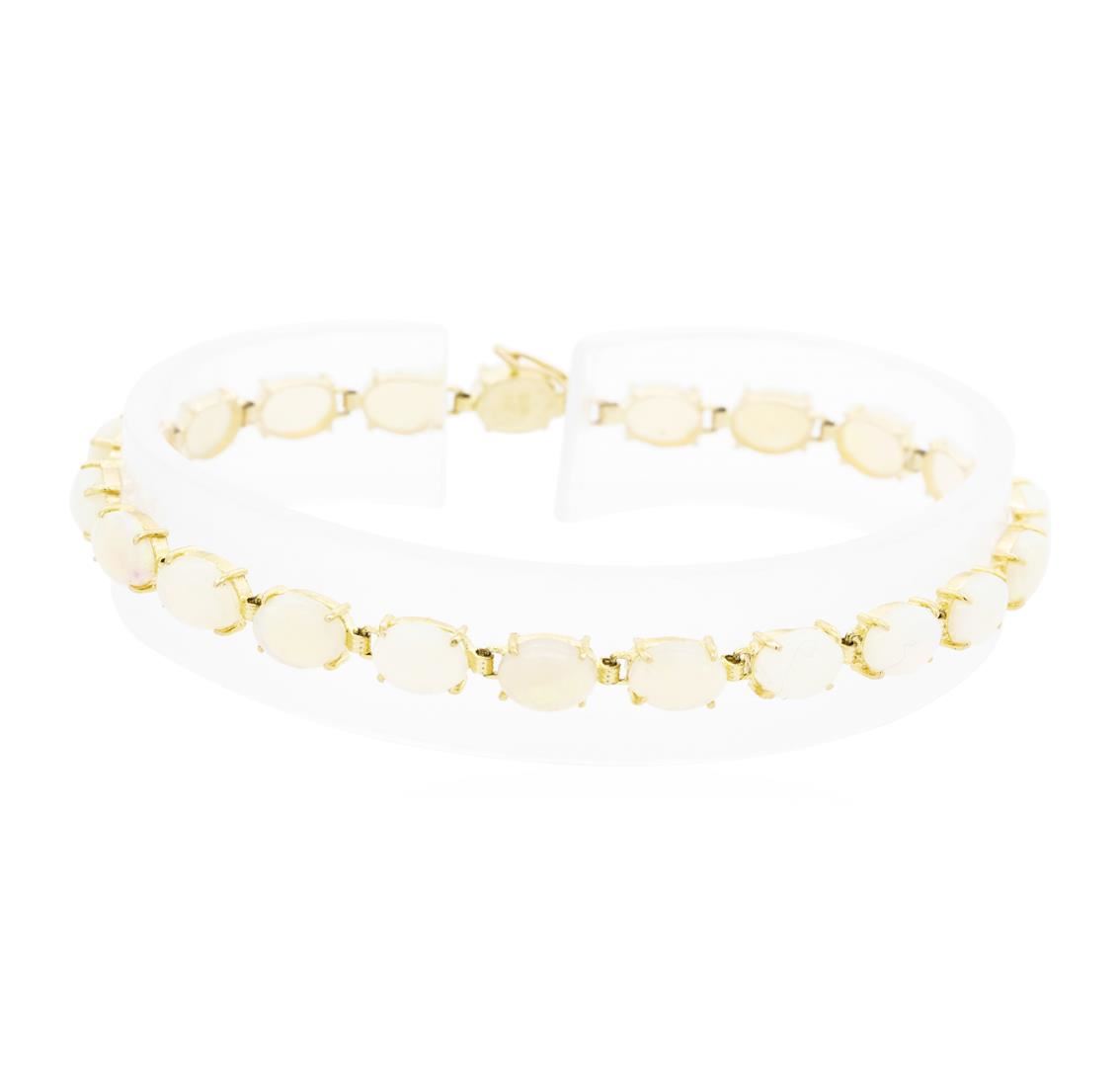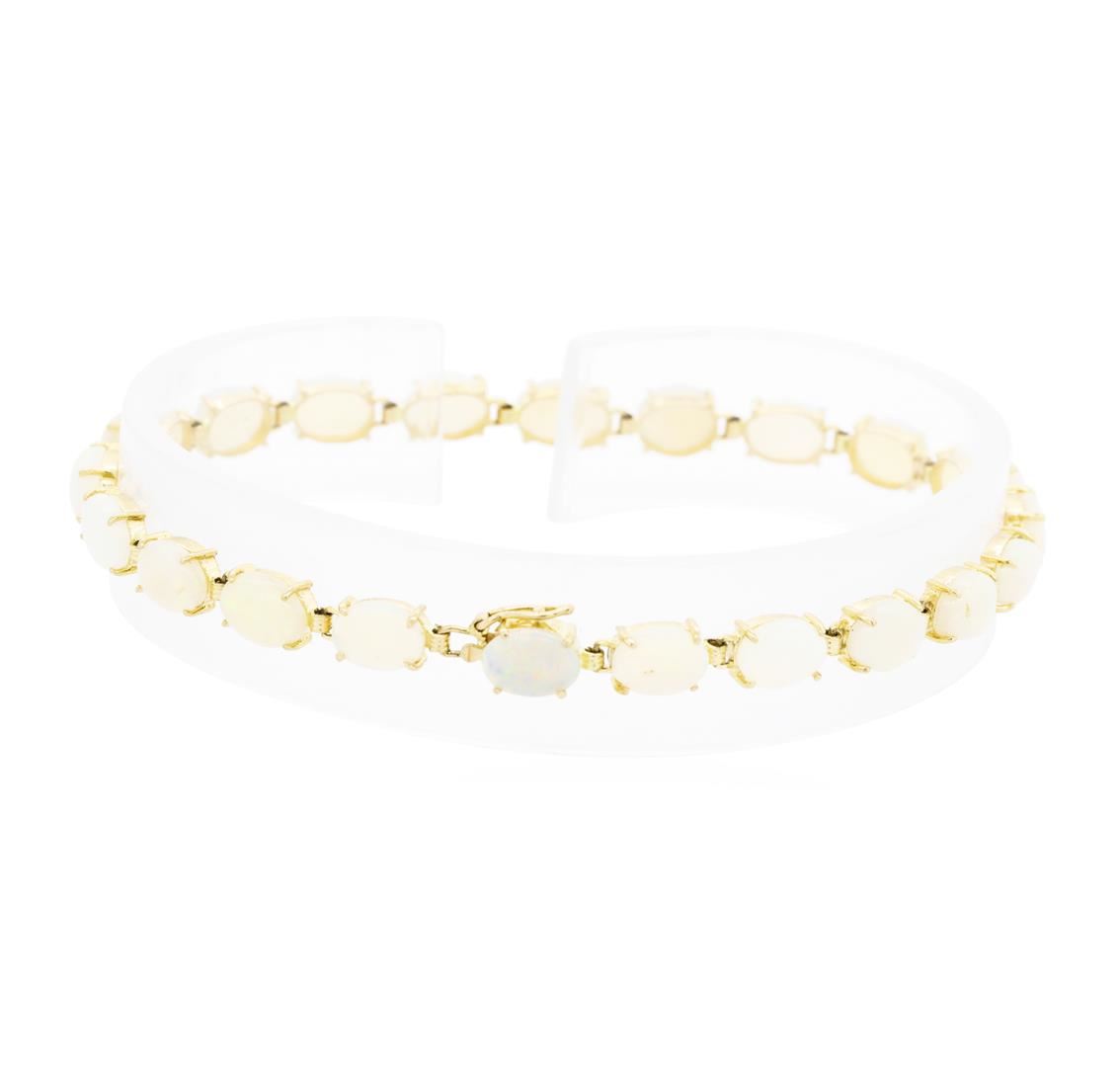 One opal bracelet featuring: 14KT yellow gold weighing 6.0 grams containing opals weighing 7.00ctw. The bracelet measures 7.25 inches in length.