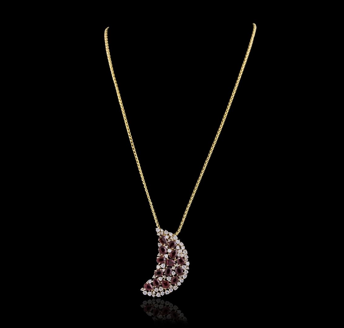 One electronically tested 14KT yellow gold Ladies combination cast & assembled pendant & chain 17.0" long, medium fancy link with a lobster claw clasp with a bright polish finish. Condition is very good. Identified with markings of "14K". Containing: Five prong set pear modified brilliant cut natural rubies, measuring 5.50 x 4.20 x 2.73mm, approximate. Total Weight of 2.50ct., clarity is moderately included, type II, medium, moderately strong, red color, (GIA R 5/4), cut is good. Nine prong set oval modified brilliant cut natural rubies, measuring 6.00 x 4.00 x 2.60mm, approximate. Total Weight of 4.50ct., clarity is moderately included, medium, moderately strong, red color, (GIA R 5/4), cut is good. Forty-Nine prong set round brilliant cut diamonds, measuring 2.10 - 1.30 x 1.02mm (depth est.) approximate. Total Weight of 49 Stones = 1.20ct. Clarity: SI-2 to I-1. Color: I - J, Cut is Good. Colored gemstones are presumed to have been subjected to commonly used enhancement processes. All diamonds and colored gemstones are graded in the mounting, unless otherwise stated. Total Weight of Colored Stones 7.00ct. Total Weight of Diamonds 1.20ct. Total Weight of Pendant & Chain 13.80 grams. GGL Appraised at $9,580.00.
