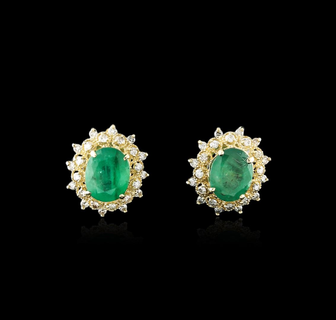 One pair electronically tested 14KT yellow gold ladies cast emerald and diamond earrings with friction posts with a bright polish finish. Identified with markings of "14K". Condition is new. Containing: Two prong set oval modified brilliant cut natural emeralds, measuring 11.20 x 9.20 x 5.98mm, approximate total weight of 7.04ct., clarity is heavily included, type III, medium, moderately strong, green color, (GIA G 5/4), cut is good. Twenty-Four prong set round brilliant cut diamonds, measuring 1.50 - 1.30 x 0.84mm (depth est.) approximate total weight of 24 Stones = 0.24ct. Clarity: SI-2 to I-1. Color: K - L, Cut is Good. Diamonds and colored gemstones are graded in the mounting, unless otherwise stated. Colored gemstones are presumed to have been subjected to commonly used enhancement processes. Total Weight of Colored Stones 7.04ct. Total Weight of Diamonds 0.24ct. Total Weight of Earrings 7.00 grams. GGL Appraised at $4,560.00.