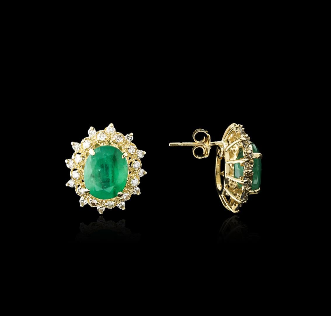 One pair electronically tested 14KT yellow gold ladies cast emerald and diamond earrings with friction posts with a bright polish finish. Identified with markings of "14K". Condition is new. Containing: Two prong set oval modified brilliant cut natural emeralds, measuring 11.20 x 9.20 x 5.98mm, approximate total weight of 7.04ct., clarity is heavily included, type III, medium, moderately strong, green color, (GIA G 5/4), cut is good. Twenty-Four prong set round brilliant cut diamonds, measuring 1.50 - 1.30 x 0.84mm (depth est.) approximate total weight of 24 Stones = 0.24ct. Clarity: SI-2 to I-1. Color: K - L, Cut is Good. Diamonds and colored gemstones are graded in the mounting, unless otherwise stated. Colored gemstones are presumed to have been subjected to commonly used enhancement processes. Total Weight of Colored Stones 7.04ct. Total Weight of Diamonds 0.24ct. Total Weight of Earrings 7.00 grams. GGL Appraised at $4,560.00.