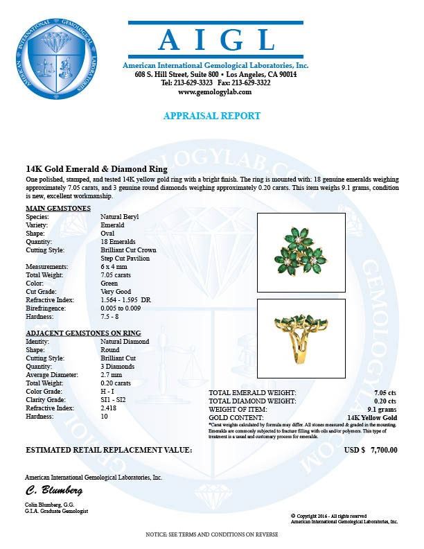 One 14KT Yellow Gold 7.05ctw Emerald and Diamond Ring. (18) Emeralds with a total weight of 7.05cts. (3) diamonds with a total weight of 0.20cts. Total weight of the ring is 9.1 grams.
