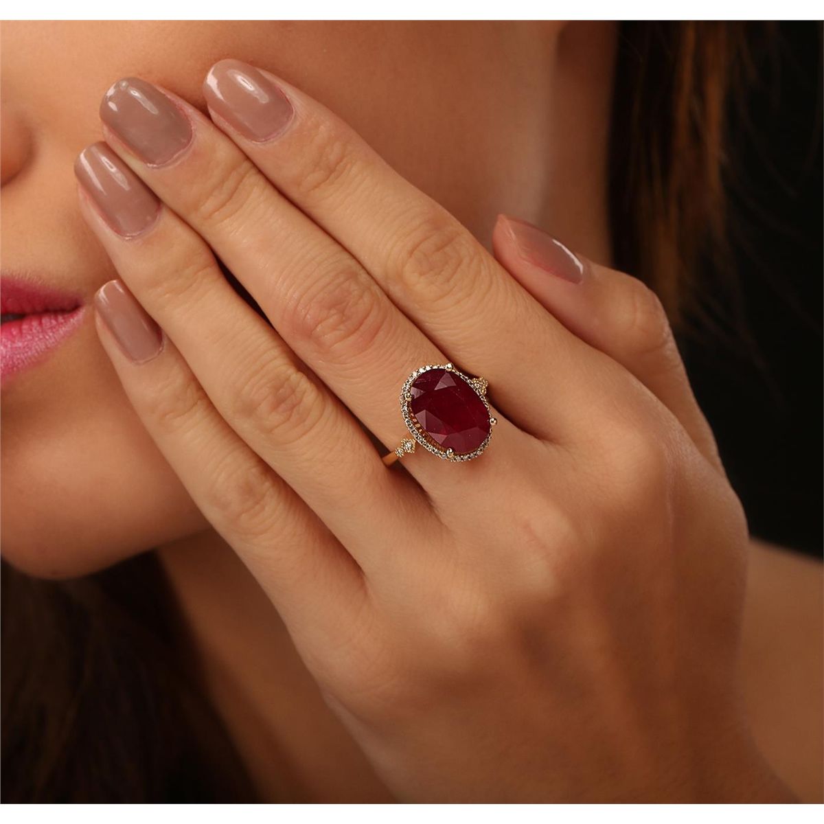 One electronically tested 14KT yellow gold ladies cast ruby and diamond ring. The featured ruby is set within a diamond bezel supported by diamond accented shoulders, completed by a two millimeter wide band. Bright polish finish with milgrain detailing. Trademark is PMI. Identified with markings of "14K". Condition is new, good workmanship. Containing: One prong set oval mixed cut natural ruby, measuring 14.00 x 9.90 x 5.70mm, 10%. bulge factor, approximate weight of 7.16ct., clarity is heavily included, type II, dark, very slightly brownish, slightly purplish red color, (GIA slpR 7/3), cut is good. Transmitting light somewhat diffusely, transparent to translucent. Naturally occurring internal & external characteristics are present. Indications of laboratory high temperature heat treatment, with glass & flux additives. Graded in the setting. Ruby has a low tolerance to rhodium plating, repolishing the surface, & ultrasonic cleaning. Forty-Two prong and bezel set round brilliant cut diamonds, measuring 1.10 - 1.00 x 0.63mm (depth est.) approximate total weight of 42 Stones = 0.27ct. Graded in the setting. Clarity: SI-1 to I-1. Color: G - I. Total Weight of Colored Stones 7.16ct. Total Weight of Diamonds 0.27ct. Total Weight of Ring 5.51 grams. AIG Appraised at $3,290.00.