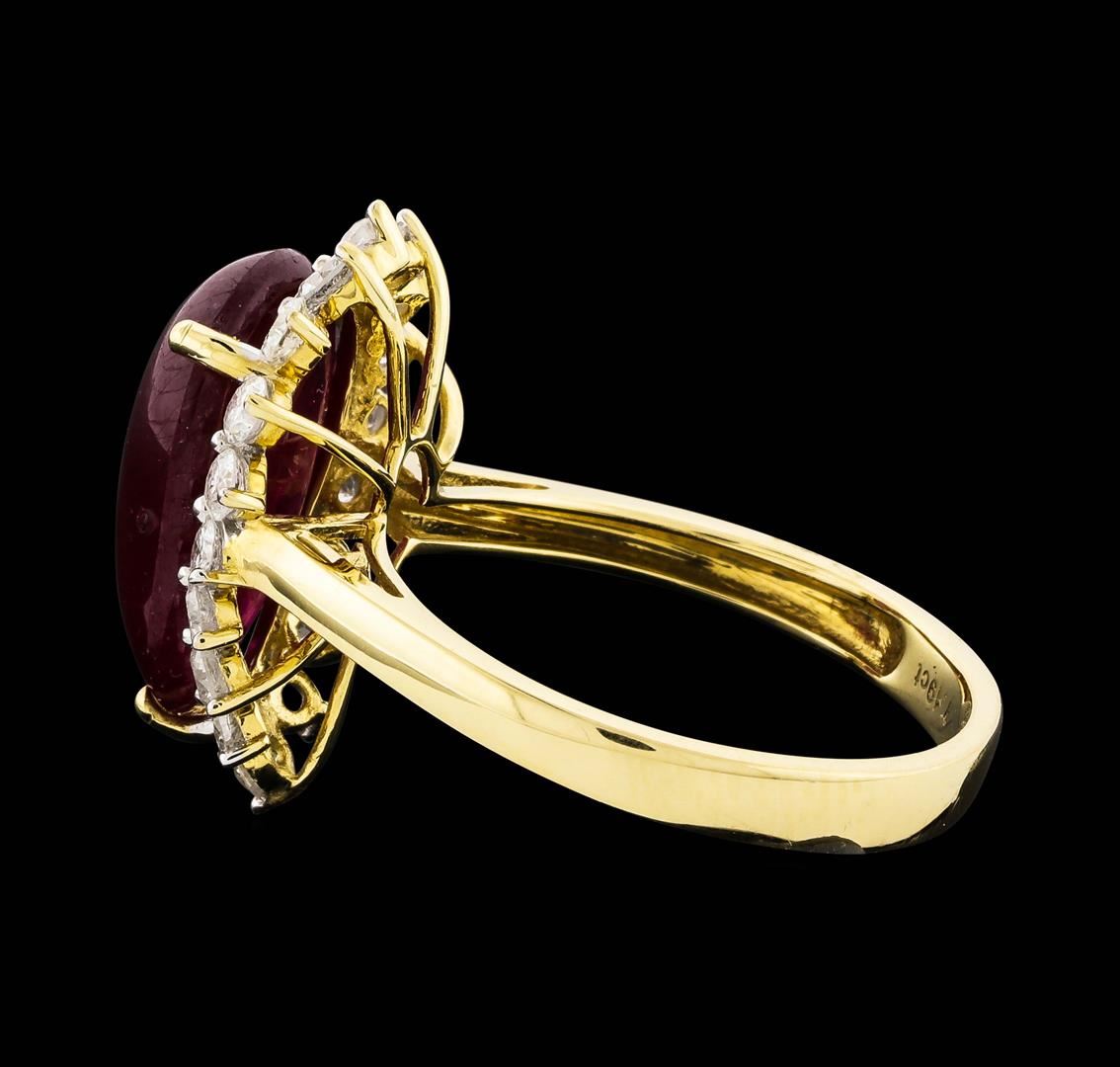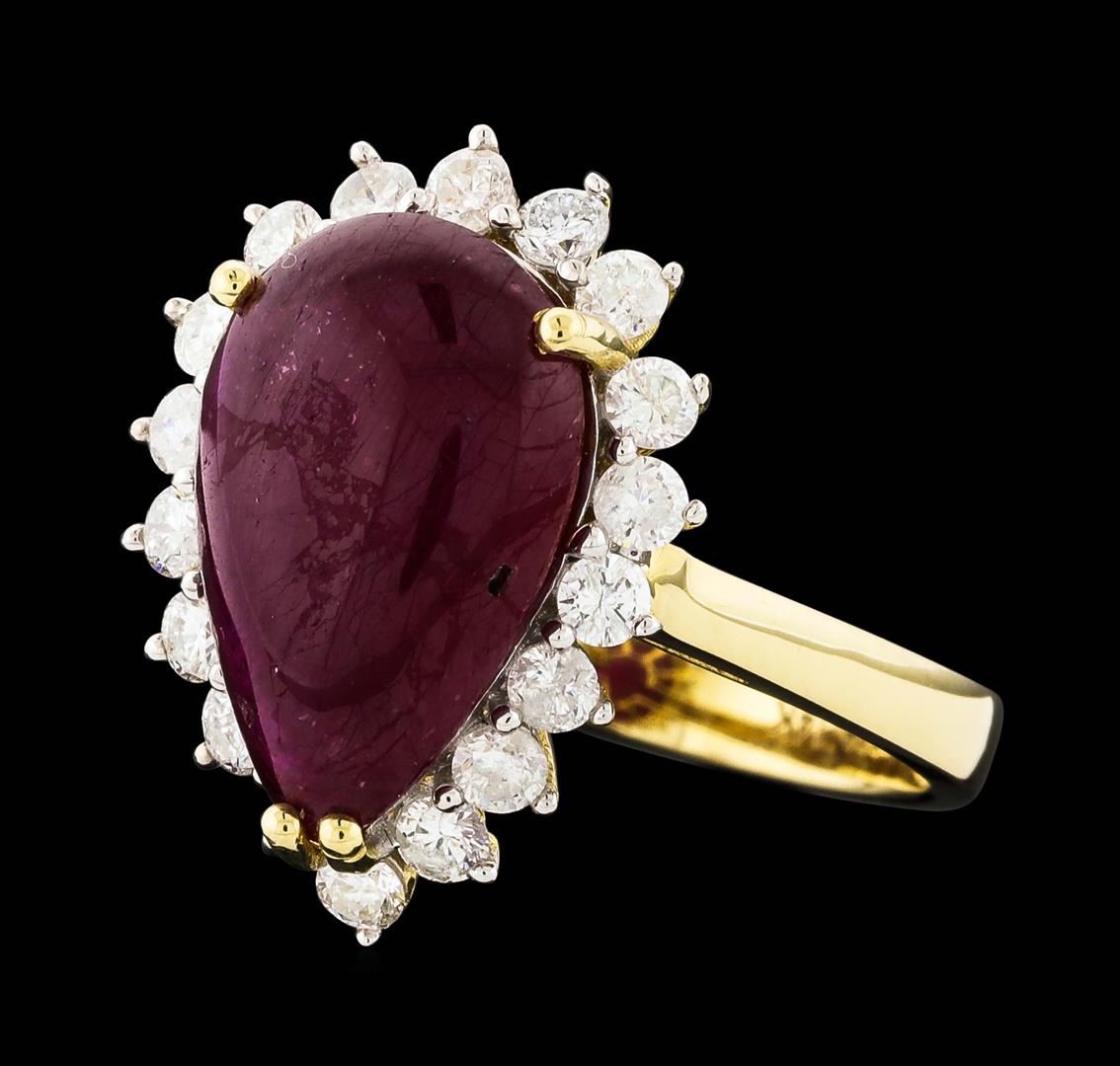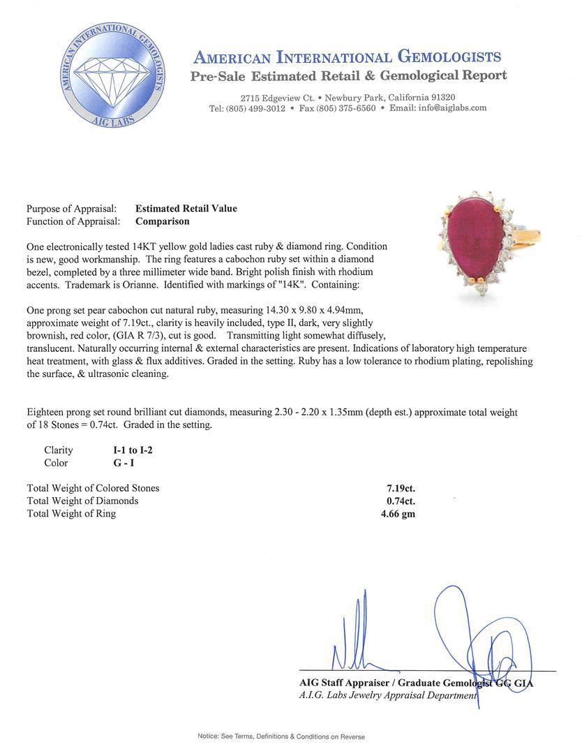 One electronically tested 14KT yellow gold ladies cast ruby & diamond ring. The ring features a cabochon ruby set within a diamond bezel, completed by a three millimeter wide band. Bright polish finish with rhodium accents. Trademark is Orianne. Identified with markings of "14K". Condition is new, good workmanship. Containing: One prong set pear cabochon cut natural ruby, measuring 14.30 x 9.80 x 4.94mm, approximate weight of 7.19ct., clarity is heavily included, type II, dark, very slightly brownish, red color, (GIA R 7/3), cut is good. Transmitting light somewhat diffusely, translucent. Naturally occurring internal & external characteristics are present. Indications of laboratory high temperature heat treatment, with glass & flux additives. Graded in the setting. Ruby has a low tolerance to rhodium plating, repolishing the surface, & ultrasonic cleaning. Eighteen prong set round brilliant cut diamonds, measuring 2.30 - 2.20 x 1.35mm (depth est.) approximate total weight of 18 Stones = 0.74ct. Graded in the setting. Clarity: I-1 to I-2. Color: G - I. Total Weight of Colored Stones 7.19ct. Total Weight of Diamonds 0.74ct. Total Weight of Ring 4.66gm. AIG Appraised.