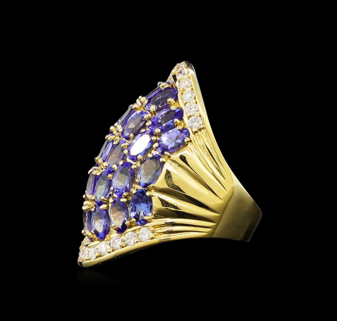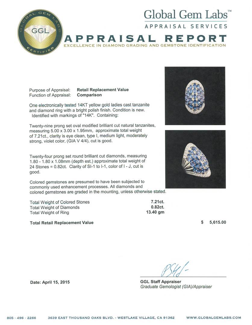 One electronically tested 14KT yellow gold ladies cast tanzanite and diamond ring with a bright polish finish. Identified with markings of "14K". Condition is new. Containing: Twenty-nine prong set oval modified brilliant cut natural tanzanites, measuring 5.00. x 3.00. x 1.95mm, approximate total weight of 7.21ct., clarity is eye clean, type I, medium light, moderately strong, violet color, (GIA V 4/4), cut is good. Twenty-Four prong set round brilliant cut diamonds, measuring 1.80 - 1.80 x 1.08mm (depth est.) approximate total weight of 24 Stones = 0.82ct. Clarity: SI-1 to I-1. Color: I - J, Cut is Good. Colored gemstones are presumed to have been subjected to commonly used enhancement processes. All diamonds and colored gemstones are graded in the mounting, unless otherwise stated. Total Weight of Colored Stones 7.21ct. Total Weight of Diamonds 0.82ct. Total Weight of Ring 13.40 grams. GGL Appraised at $5,615.00.