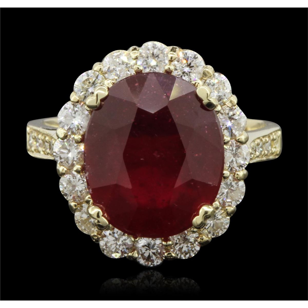 One electronically tested 14KT yellow gold ladies cast ruby & diamond ring. Condition is new, good workmanship. The featured ruby is set within a diamond bezel supported by diamond set shoulders and completed by a three millimeter wide band. Bright polish finish with milgrain detailing. Identified with markings of "K14". Containing: One prong set oval mixed cut natural ruby, measuring 12.30 x 10.30 x 6.30mm, 12% bulge factor, approximate weight of 7.21ct. with a medium Red fluorescence, clarity is moderately included, type II, medium dark, moderately strong, slightly purplish red color, (GIA slpR 6/4), cut is good. Transmitting light somewhat diffusely, transparent to translucent. Naturally occurring internal & external characteristics are present. Indications of laboratory high temperature heat treatment, with glass & flux additives. Colored Stone Grading Report attached. Graded in the setting. Ruby has a low tolerance to rhodium plating, repolishing the surface, & ultrasonic cleaning. Sixteen prong set round brilliant cut diamonds, measuring 2.50 - 2.40 x 1.49mm (depth est.) approximate. Total Weight of 16 Stones = 0.97ct. Graded in the setting. Clarity: SI-2 to I-1. Color: G - I Ten prong set round brilliant cut diamonds, measuring 1.50 - 1.10 x 0.79mm (depth est.) approximate. Total Weight of 10 Stones = 0.18ct. Graded in the setting. Clarity: SI-2 to I-1. Color: G - I. Total Weight of Colored Stones 7.21ct. Total Weight of Diamonds 1.15ct. Total Weight of Ring 6.92 grams. AIG Appraised at $6,185.00.