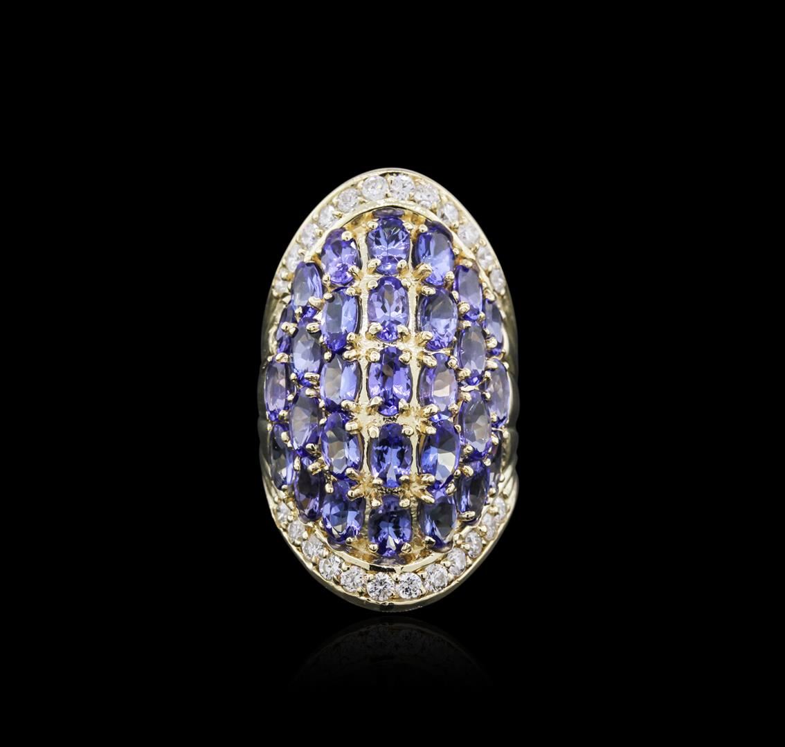 One electronically tested 14KT yellow gold ladies cast tanzanite and diamond ring with a bright polish finish. Identified with markings of "14K". Condition is new. Containing: Twenty-nine prong set oval modified brilliant cut natural tanzanites, measuring 5.00. x 3.00. x 1.95mm, approximate total weight of 7.21ct., clarity is eye clean, type I, medium light, moderately strong, violet color, (GIA V 4/4), cut is good. Twenty-Four prong set round brilliant cut diamonds, measuring 1.80 - 1.80 x 1.08mm (depth est.) approximate total weight of 24 Stones = 0.82ct. Clarity: SI-1 to I-1. Color: I - J, Cut is Good. Colored gemstones are presumed to have been subjected to commonly used enhancement processes. All diamonds and colored gemstones are graded in the mounting, unless otherwise stated. Total Weight of Colored Stones 7.21ct. Total Weight of Diamonds 0.82ct. Total Weight of Ring 13.40 grams. GGL Appraised at $5,615.00.