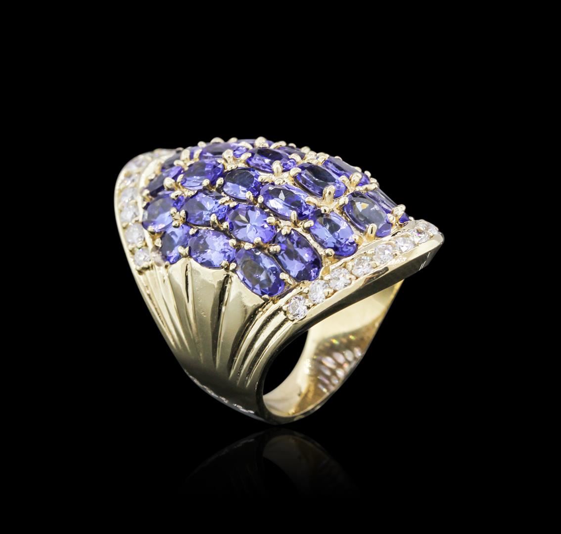 One electronically tested 14KT yellow gold ladies cast tanzanite and diamond ring with a bright polish finish. Identified with markings of "14K". Condition is new. Containing: Twenty-nine prong set oval modified brilliant cut natural tanzanites, measuring 5.00. x 3.00. x 1.95mm, approximate total weight of 7.21ct., clarity is eye clean, type I, medium light, moderately strong, violet color, (GIA V 4/4), cut is good. Twenty-Four prong set round brilliant cut diamonds, measuring 1.80 - 1.80 x 1.08mm (depth est.) approximate total weight of 24 Stones = 0.82ct. Clarity: SI-1 to I-1. Color: I - J, Cut is Good. Colored gemstones are presumed to have been subjected to commonly used enhancement processes. All diamonds and colored gemstones are graded in the mounting, unless otherwise stated. Total Weight of Colored Stones 7.21ct. Total Weight of Diamonds 0.82ct. Total Weight of Ring 13.40 grams. GGL Appraised at $5,615.00.