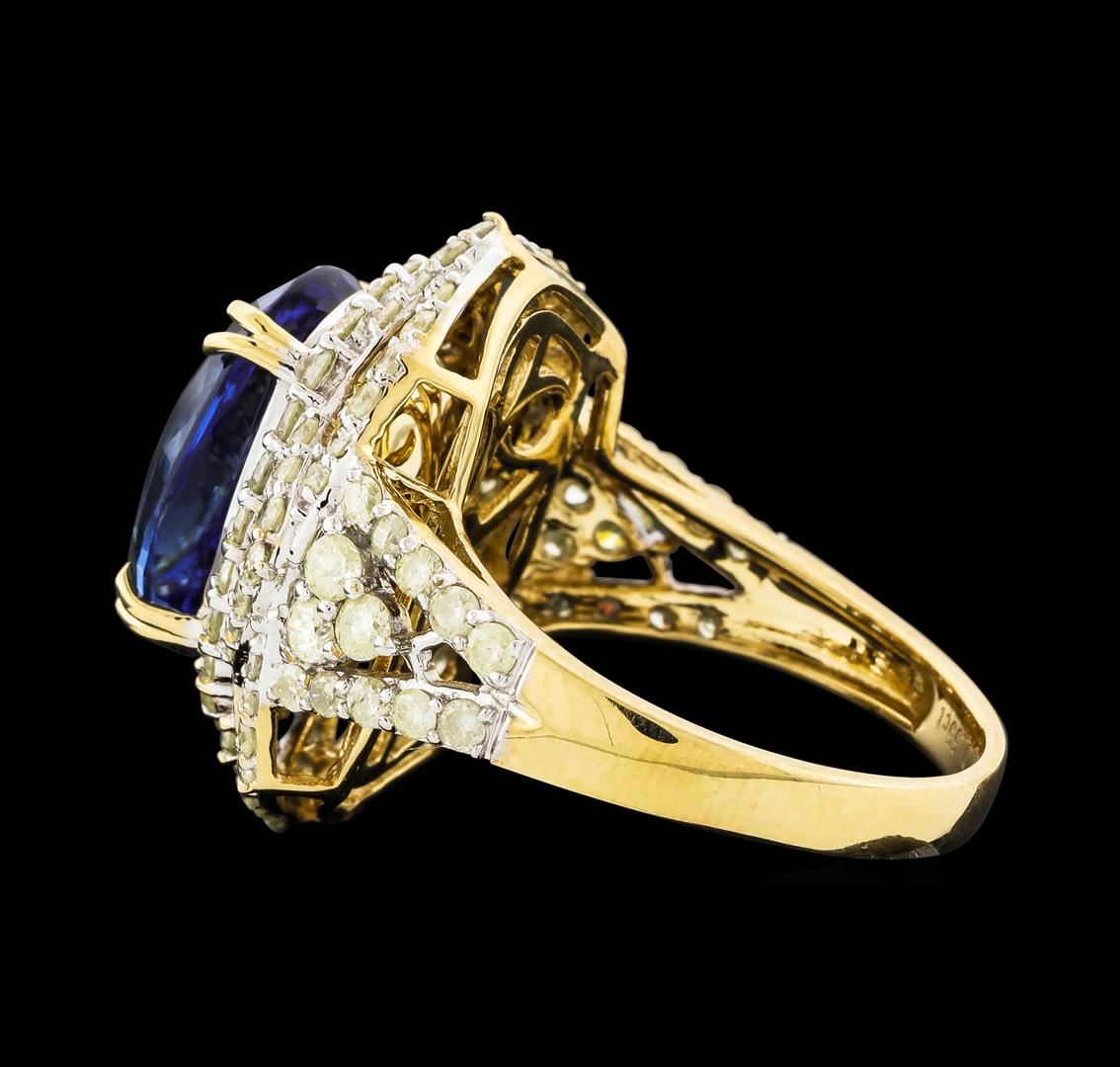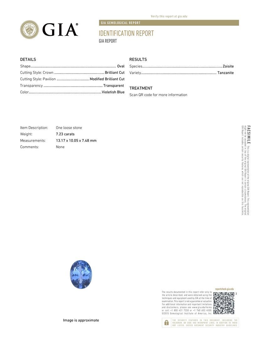 One electronically tested 14KT yellow gold ladies cast tanzanite and diamond ring. The featured tanzanite is set within a stylized diamond bezel supported by diamond set shoulders, completed by a two and one-half millimeter wide band. Bright polish finish with rhodium accents. Trademark is Orianne. Identified with markings of "14K". Condition is new, good workmanship. Containing: One prong set oval modified brilliant cut natural tanzanite, measuring 13.17 x 10.05 x 7.48mm, exact weight 7.23ct., clarity is eye clean, type I, medium dark, very slightly grayish, violetish blue color, (GIA vB 6/3), cut is good. Transmitting light with no distortion, transparent. GIA Gemological Report attached. Graded loose prior to setting in the GIA Laboratory, Report #1172461296.Tanzanite is a very rare gemstone that is only found in the country of Tanzania. Originally discovered in 1967. Tiffany & Company, named the stone Tanzanite. It is found in the Usumburu Mountains that border the Umba Valley of northern Tanzania. Tanzanite occurs in gray, brown, violet, blue, reddish-purple, & green. The gem is interesting because of its exceptional pleochroism. Rotated in different directions a tanzanite will exhibit multiple changes of color. Tanzanite has a low tolerance to ultrasonic cleaning, and should not be cleaned using this method.One Hundred Two prong set round brilliant cut diamonds approximate total weight of 102 Stones = 1.55ct. The group contains a mix of natural faint yellow and very light yellow color diamonds. Graded in the setting. Clarity: I-1 to I-2. Total Weight of Colored Stones 7.23ct. Total Weight of Diamonds 1.55ct. Total Weight of Ring 8.14gm. AIG Appraised at $19,770.00.