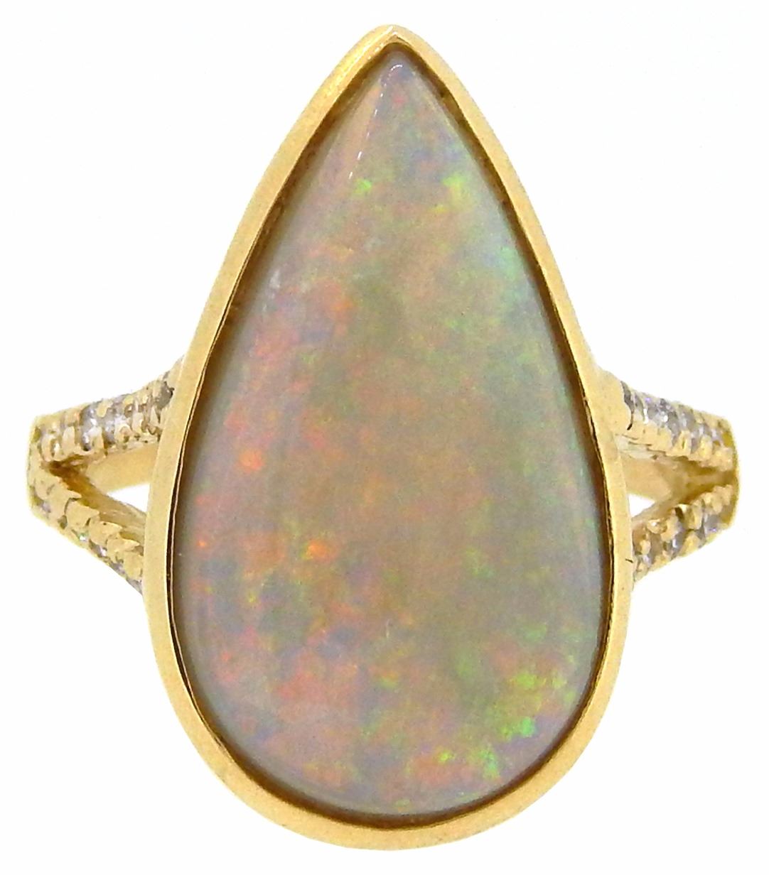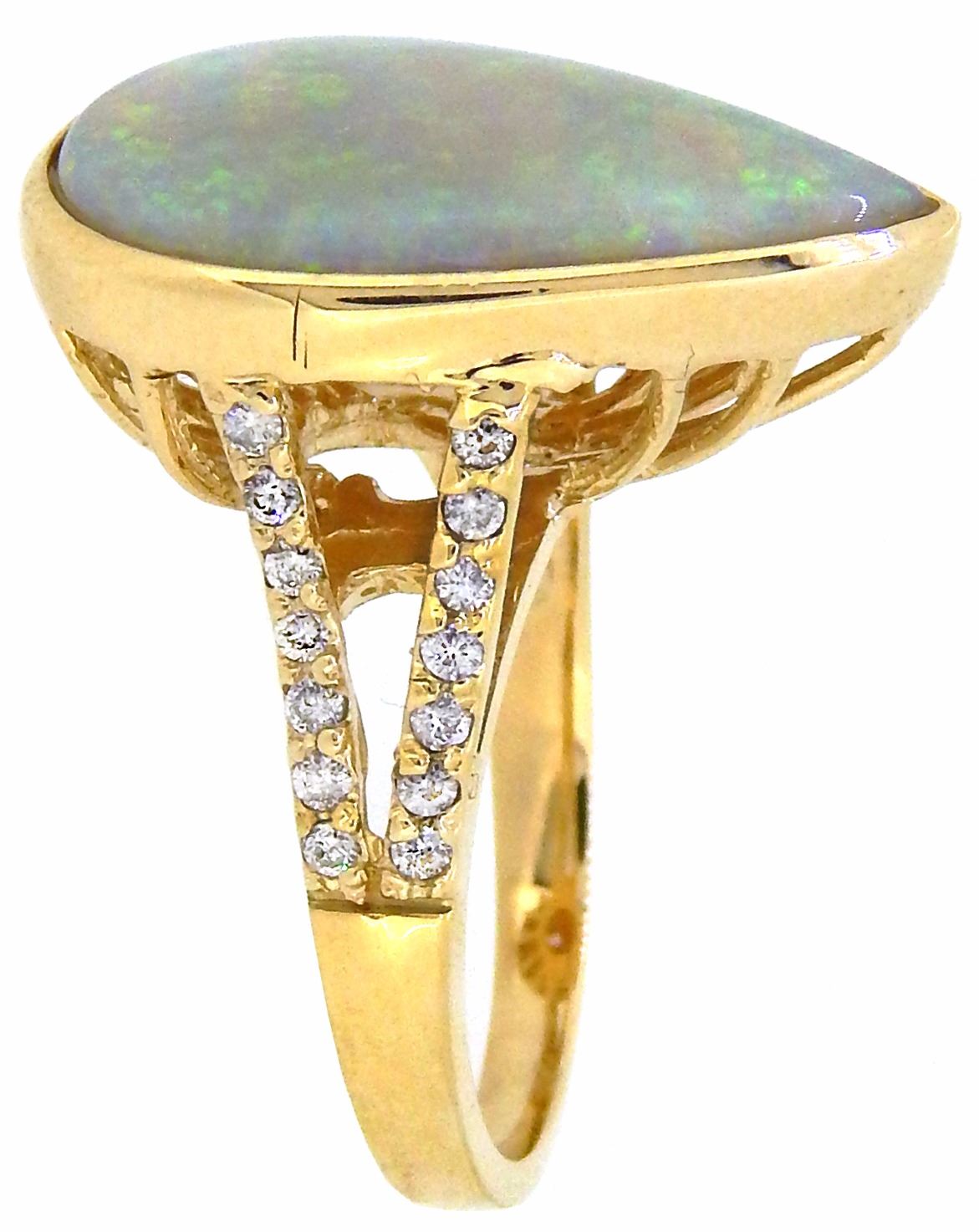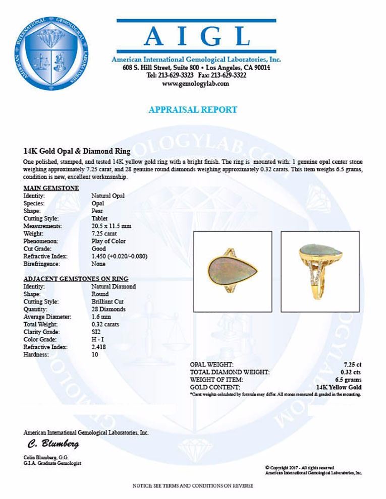 One 14KT Yellow Gold 7.25ct Opal and Diamond Ring. (1) Opal with a total weight of 7.25cts. (28) diamonds with a total weight of 0.32cts. Total weight of this ring is 6.5 grams.