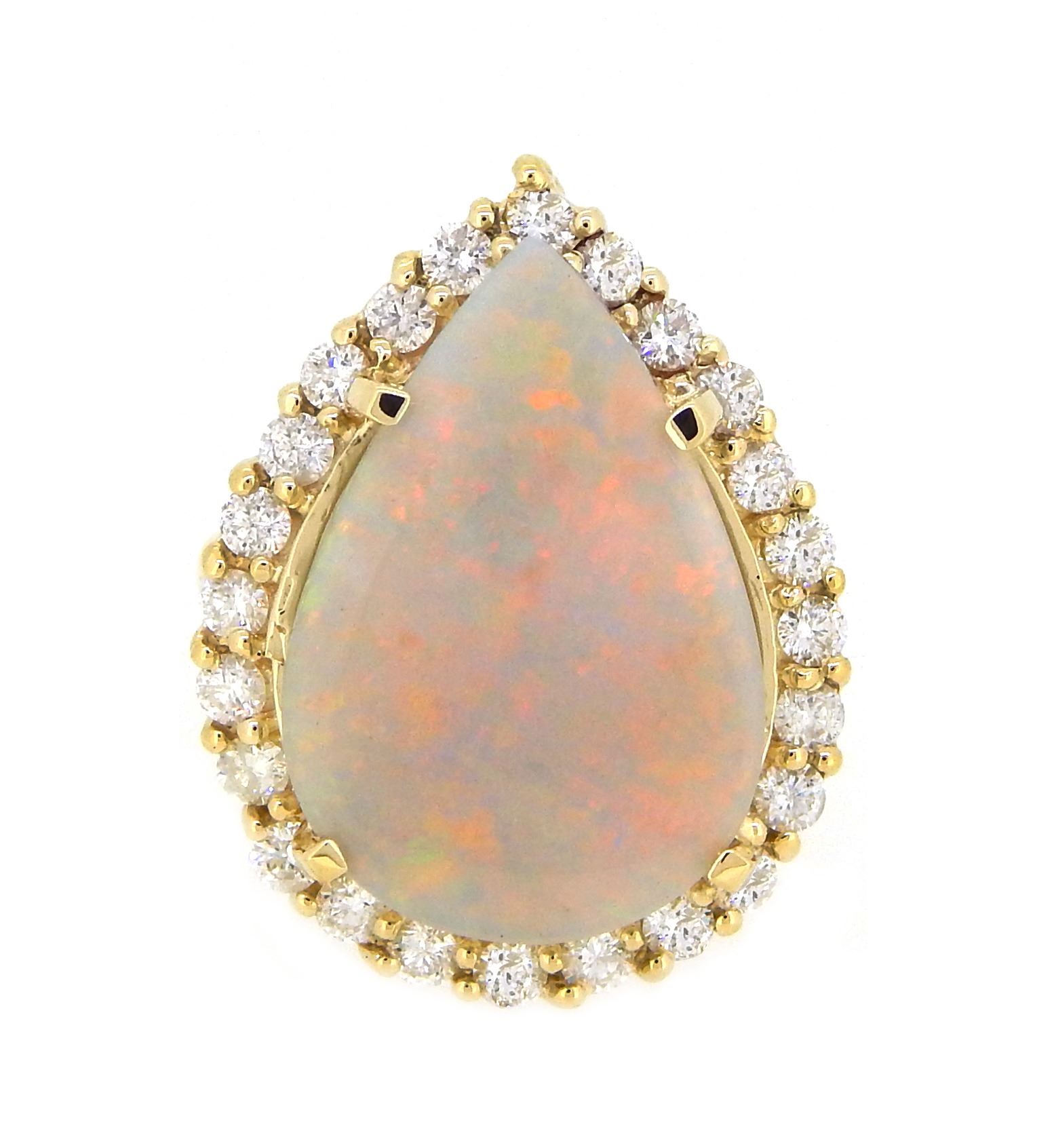 One 14KT Yellow Gold 7.25ct Opal and Diamond Ring. (1) Opal with a total weight of 7.25cts. (24) diamonds with a total weight of 1.05cts. Total weight of this ring is 9.7 grams.